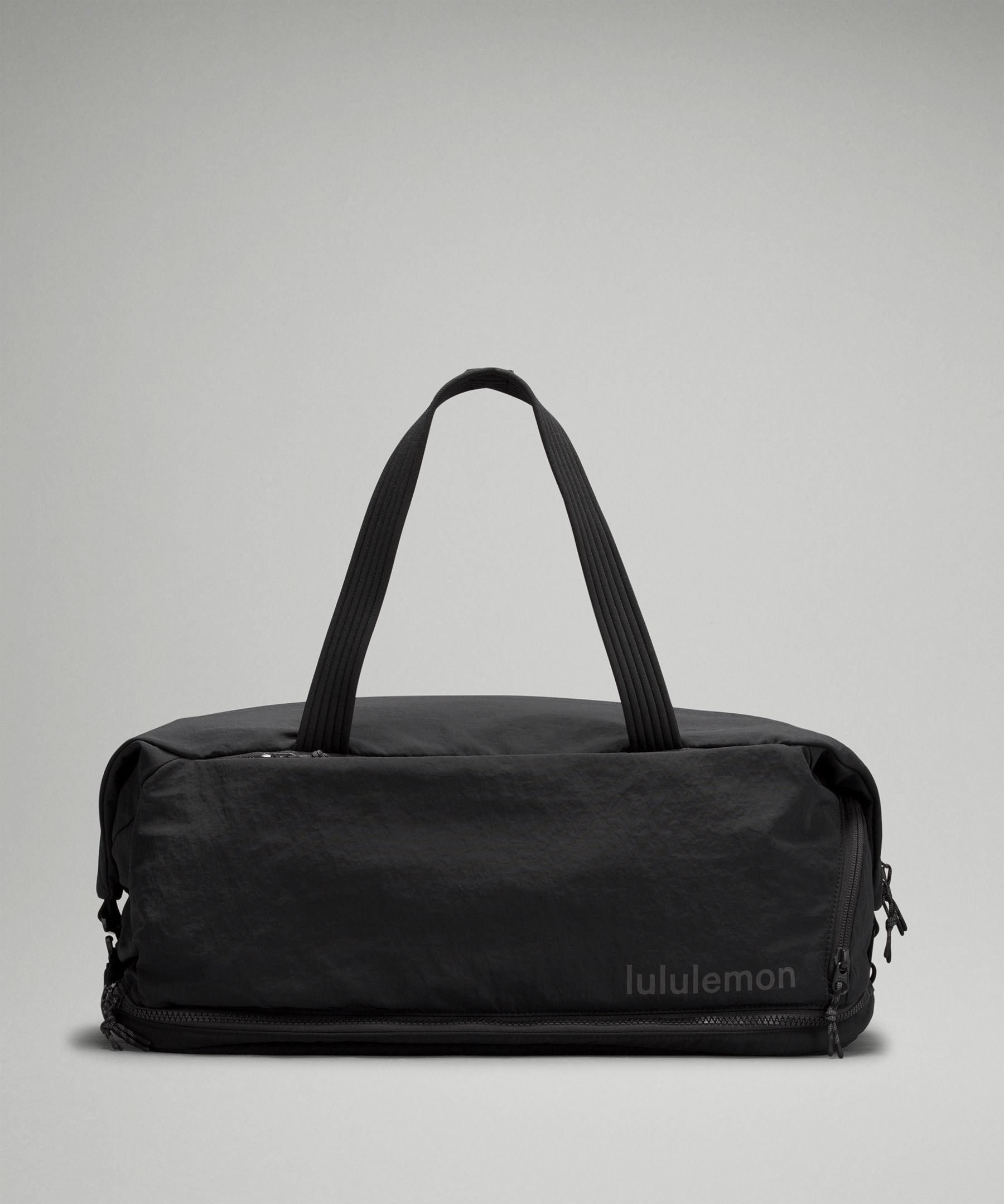 Water Repellant, Pocketed. Designed for Yoga and Training. Dimensions: W 47cm x D 27cm x H 19.5cm (18.5″ x 10.6″ x 7.7″). Volume: 30L. We took multi-use to the next level. This duffle has ample storage to pack sweat essentials and cushioned straps to maximize commuting comfort. The removable shoulder strap also doubles as a yoga mat carrier and stretching strap. | lululemon – 3-in-1 Gym Duffle Bag 30L – Color Black