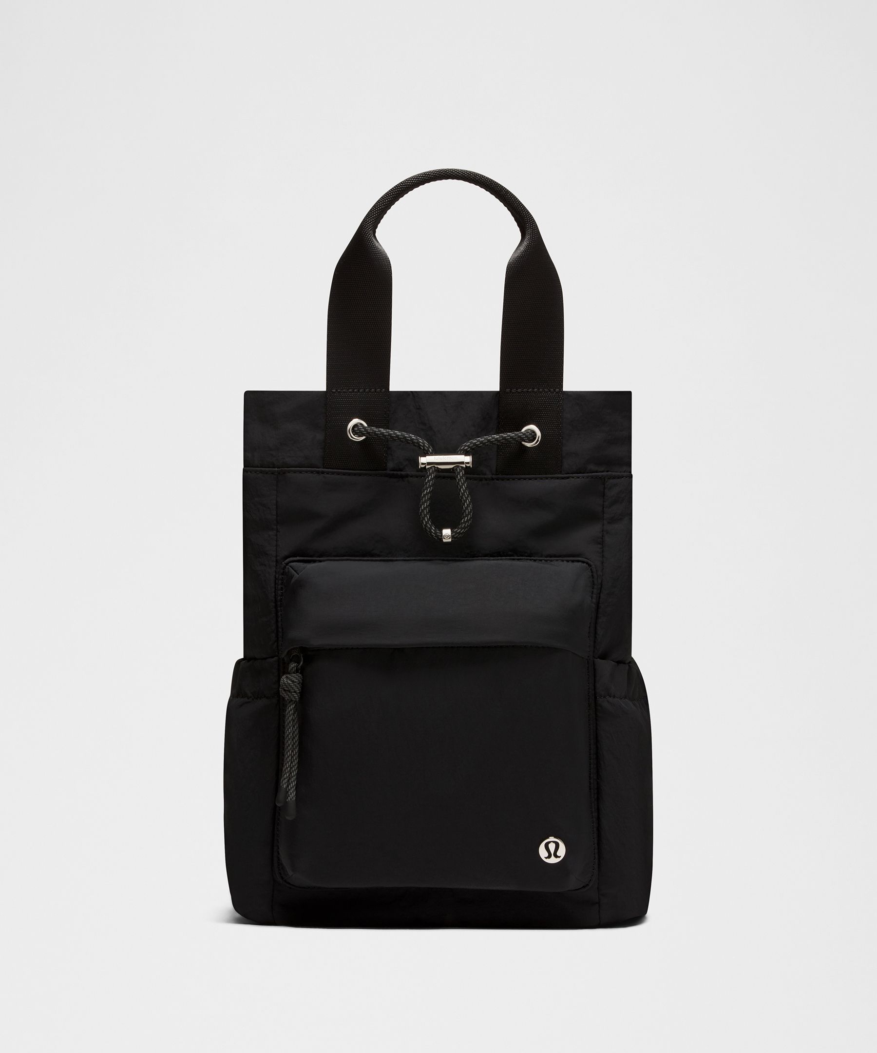 Designed for Casual. Dimensions: W 24cm x D 17cm x H 33cm (9.5″ x 6.7″ x 13″). Volume: 13.5L. One bag, two ways. This small bucket bag effortlessly converts from a cross-body to a backpack and has just enough room for your phone, sunscreen, and other daily essentials. | lululemon – Convertible Drawstring Bucket Bag Small 13.5L – Color Black/Grey/Silver