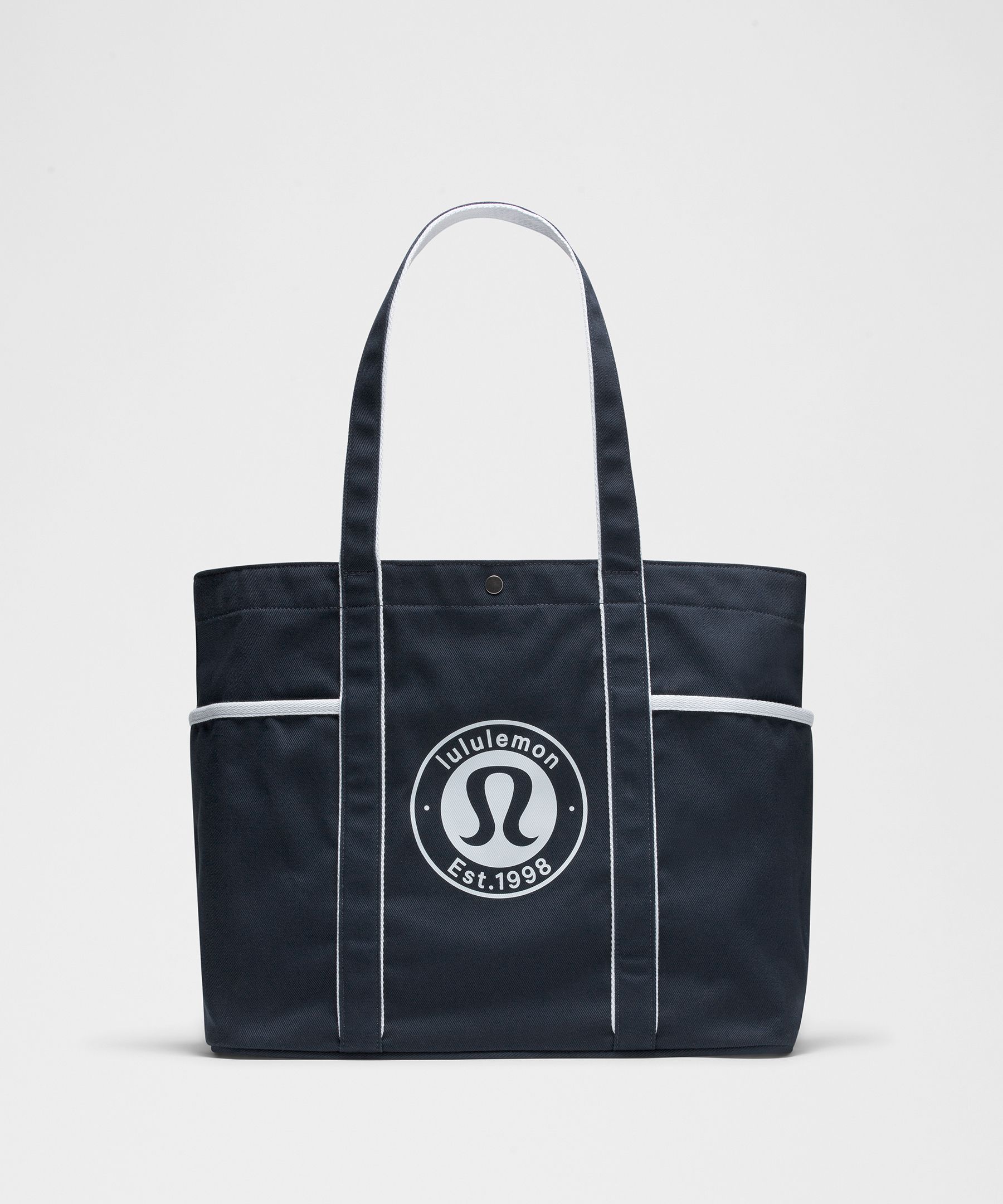 Pocketed. Designed for Casual. Dimensions: W 51cm x D 15cm x H 35cm (20.1″ x 5.9″ x 13.8″). Volume: 20L. From farmers-market finds to picnic essentials, this roomy canvas tote handles it all. Plenty of pockets and a large opening make finding your things a breeze. | lululemon – Daily Multi-Pocket Canvas Tote Bag 20L Logo – Color Blue