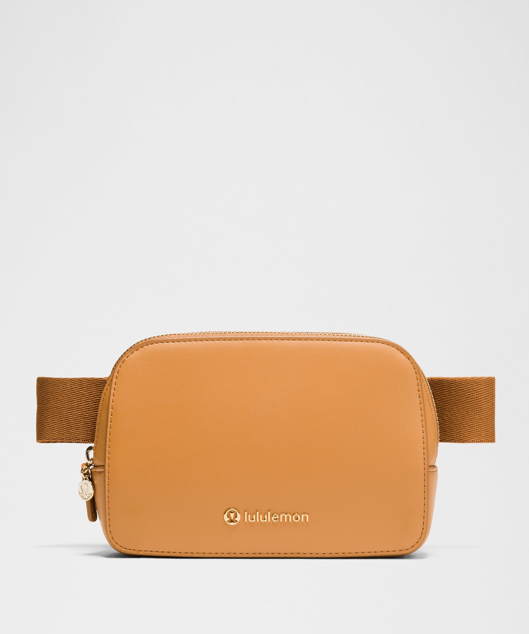 Pocketed. Designed for Casual. Bag dimensions: W 19cm x D 5cm x H 13cm (7.5″ x 2″ x 5″). Strap length when fully extended: 106cm (41.7″). Volume: 1L. Phone, keys, wallet. Keep them close in this special version of our versatile belt bag designed in a beautiful leather-like material, partially made from cactus. | lululemon – Everywhere Belt Bag 1L – Color Brown/Gold/Orange