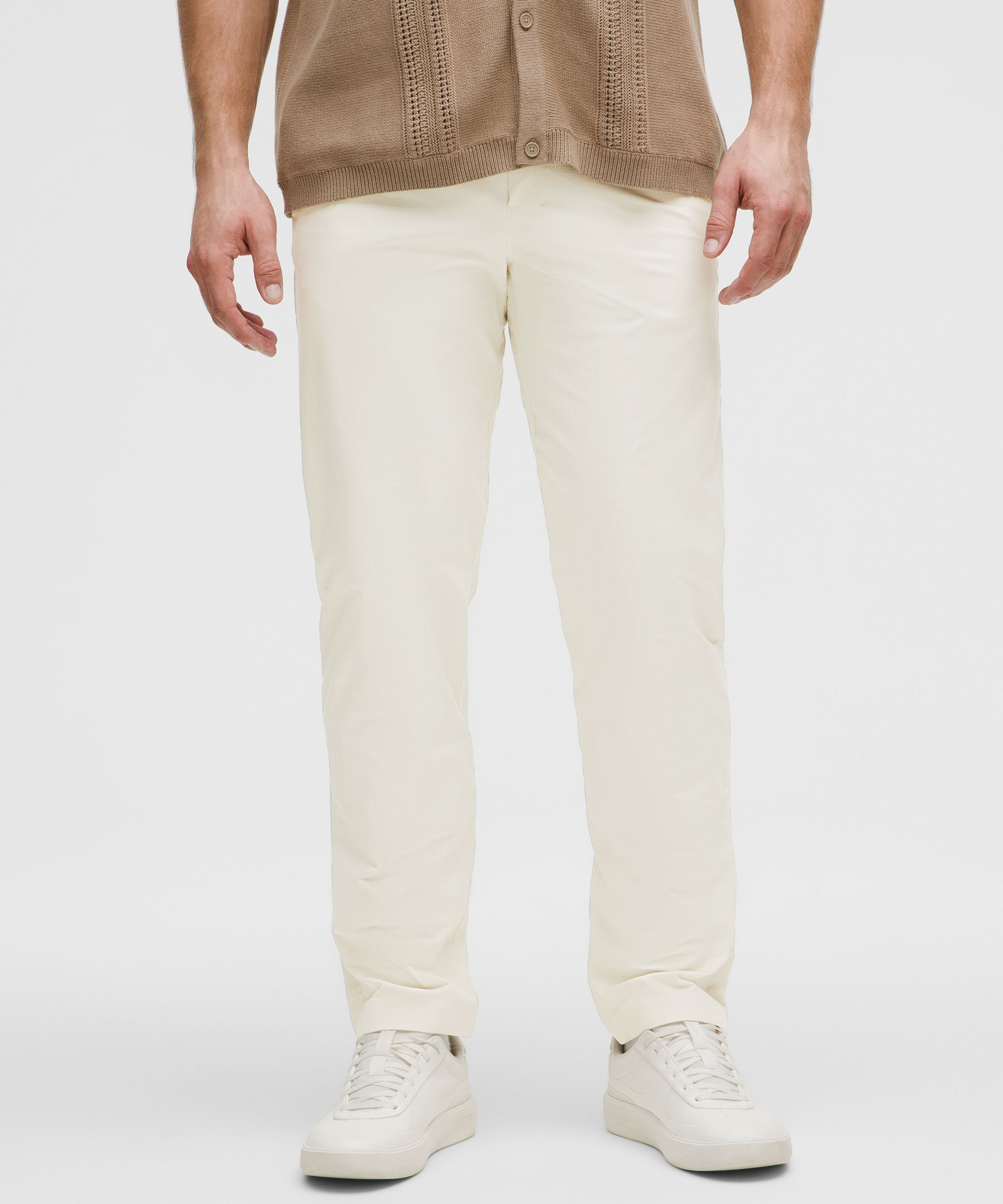 ABC Technology, Anti Stink, Reflective, Pocketed. Designed for Casual. Streamlined fit that gives glutes and thighs breathing room. Our ABC™ (Anti-Ball-Crushing) technology uses an ergonomic gusset to remove tension from the crotch of our pants so you can move in comfort. These classic-fit trousers deliver all-day comfort with an elevated look. | lululemon – Men’s ABC Classic-Fit Trousers 8L Stretch Cotton VersaTwill – Color White – Size 8