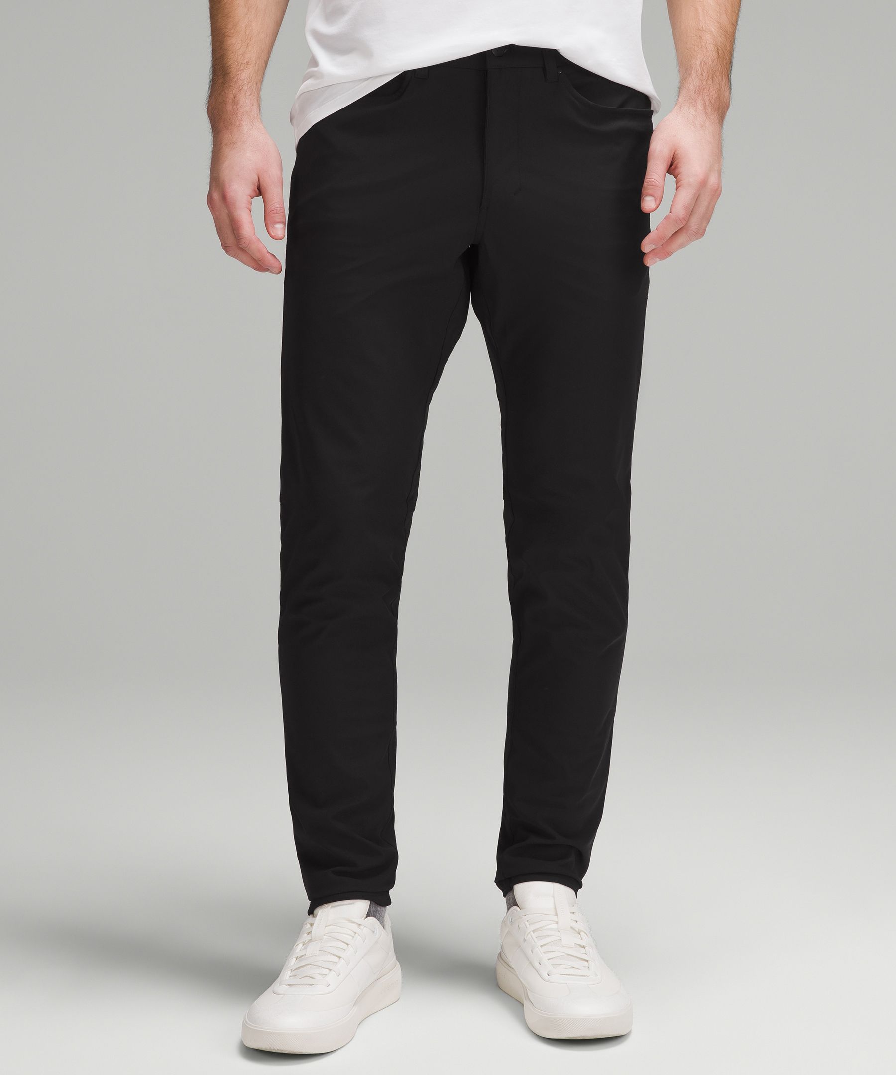 ABC Technology, Pocketed, Reflective. Designed for Casual. Slim fit that skims glutes and thighs. Tapers from knee to hem. Our ABC™ (Anti-Ball-Crushing) technology uses an ergonomic gusset to remove tension from the crotch of our pants so you can move in comfort. The five-pocket jean, reinvented. These slim-fit pants, powered by ABC technology, give you freedom of movement and all-day comfort. | lululemon – Men’s ABC Slim-Fit 5 Pocket Trousers 28L Warpstreme – Color Black – Size 10