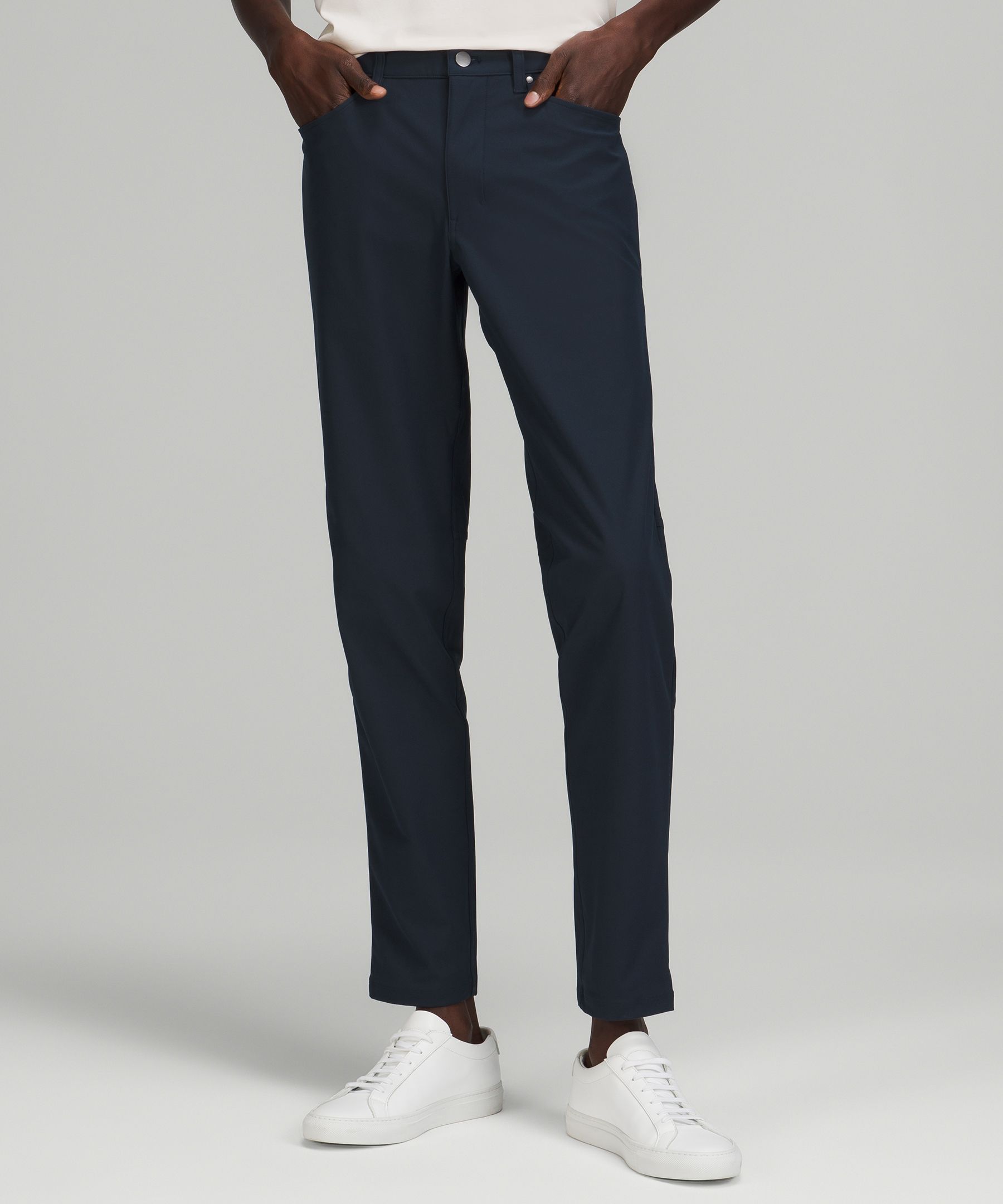 ABC Technology, Pocketed, Reflective. Designed for Casual. Slim fit that skims glutes and thighs. Tapers from knee to hem. Our ABC™ (Anti-Ball-Crushing) technology uses an ergonomic gusset to remove tension from the crotch of our pants so you can move in comfort. The five-pocket jean, reinvented. These slim-fit pants, powered by ABC technology, give you freedom of movement and all-day comfort. | lululemon – Men’s ABC Slim-Fit 5 Pocket Trousers 28L Warpstreme – Color Blue – Size 8