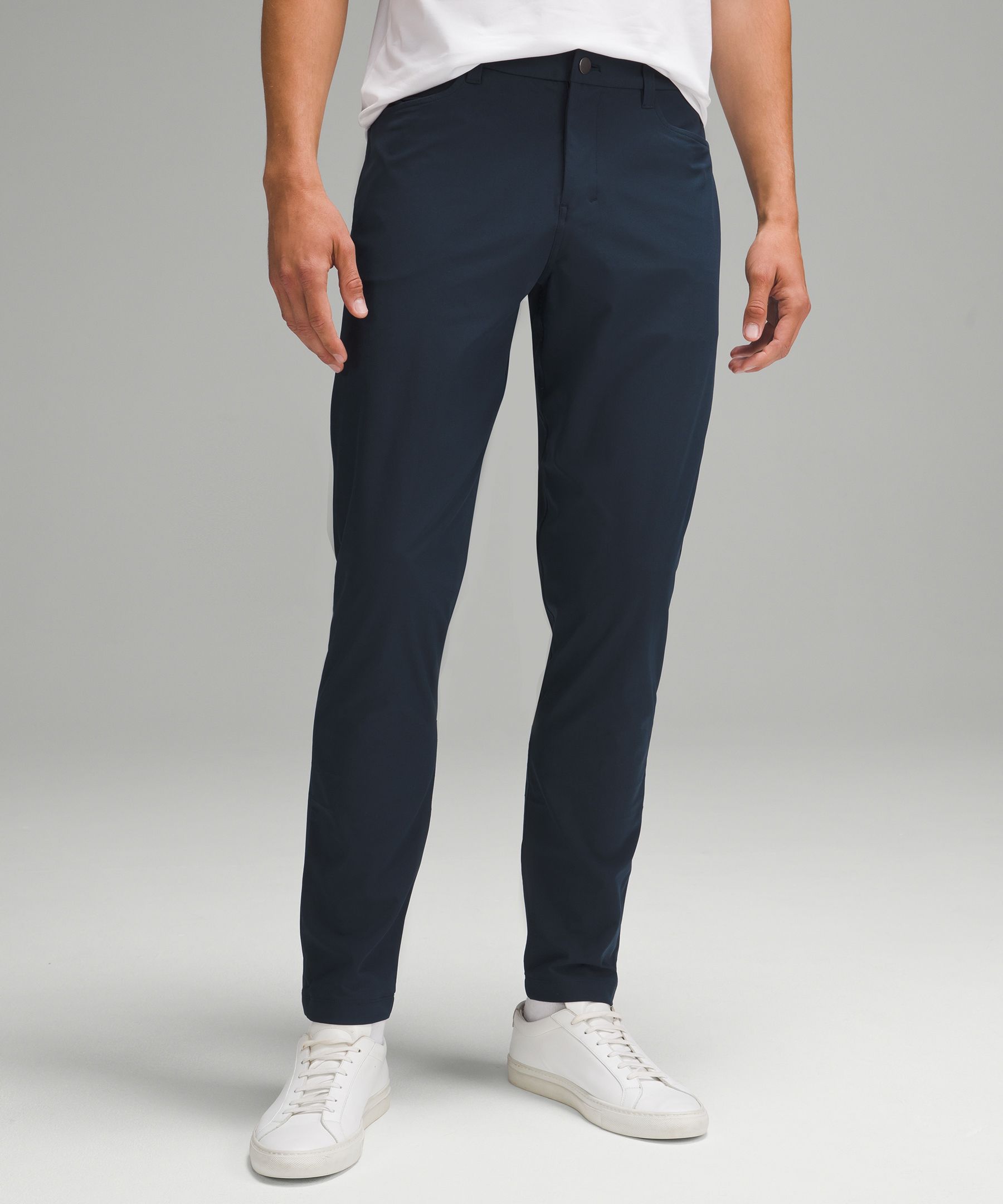 ABC Technology, Pocketed, Reflective. Designed for Casual. Slim fit that skims glutes and thighs. Tapers from knee to hem. Our ABC™ (Anti-Ball-Crushing) technology uses an ergonomic gusset to remove tension from the crotch of our pants so you can move in comfort. The five-pocket jean, reinvented. These slim-fit pants, powered by ABC technology, give you freedom of movement and all-day comfort. | lululemon – Men’s ABC Slim-Fit 5 Pocket Trousers 34L Warpstreme – Color Blue – Size 12