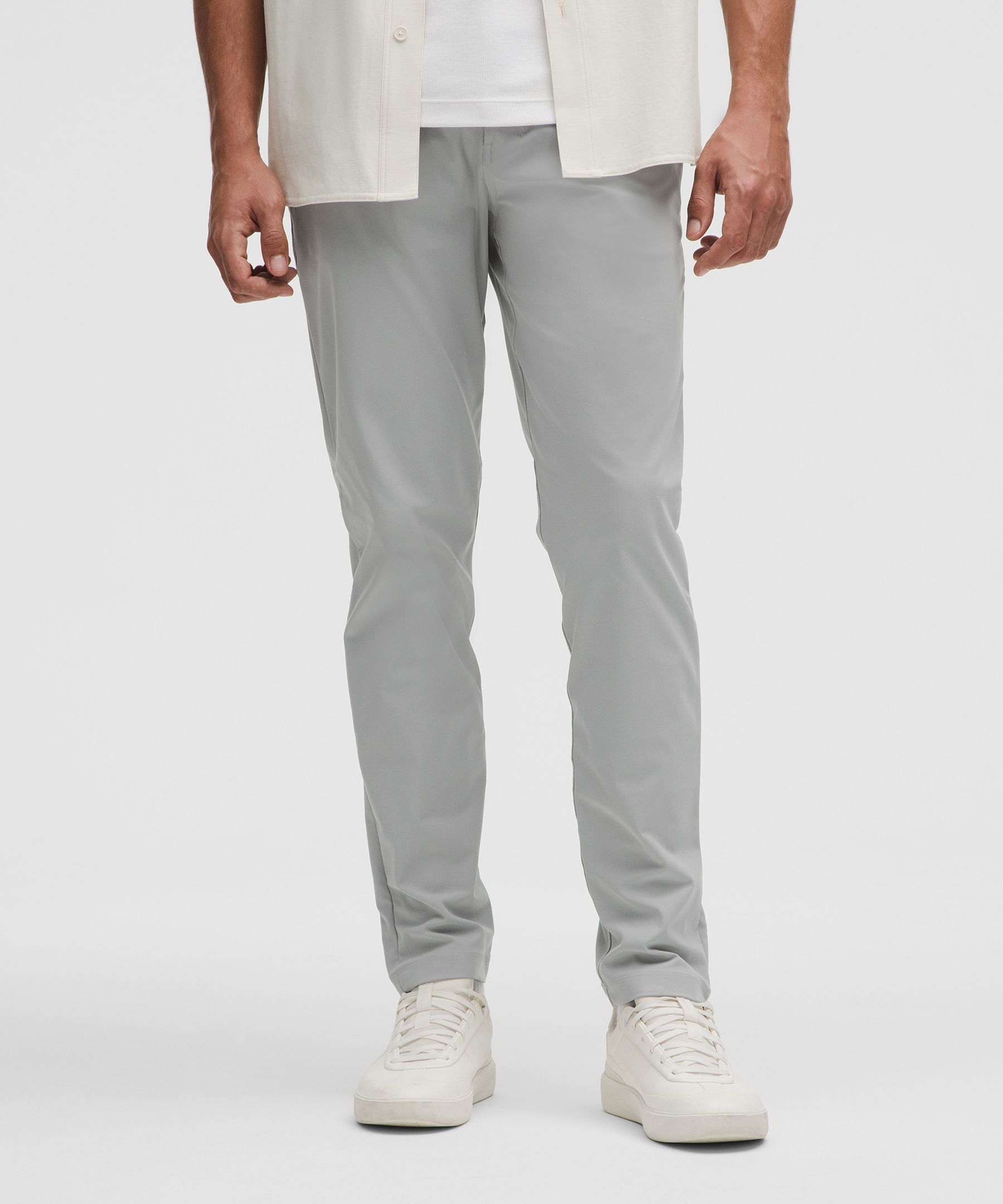 ABC Technology, Pocketed, Reflective. Designed for Casual. Slim fit that skims glutes and thighs. Tapers from knee to hem. Our ABC™ (Anti-Ball-Crushing) technology uses an ergonomic gusset to remove tension from the crotch of our pants so you can move in comfort. The five-pocket jean, reinvented. These slim-fit pants, powered by ABC technology, give you freedom of movement and all-day comfort. | lululemon – Men’s ABC Slim-Fit 5 Pocket Trousers 34L Warpstreme – Color Silver/Grey – Size 4
