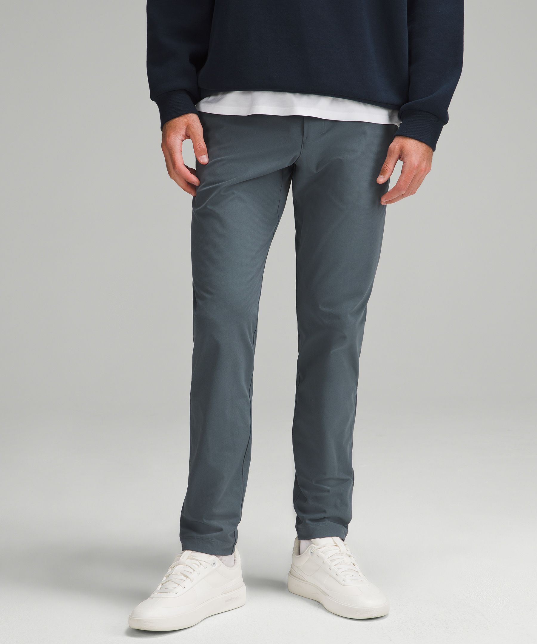ABC Technology, Pocketed, Reflective. Designed for Casual. Slim fit that skims glutes and thighs. Our ABC™ (Anti-Ball-Crushing) technology uses an ergonomic gusset to remove tension from the crotch of our pants so you can move in comfort. These slim-fit trousers deliver all-day comfort with an elevated look. | lululemon – Men’s ABC Slim-Fit Trousers 32L Warpstreme – Color Grey/Blue – Size 8