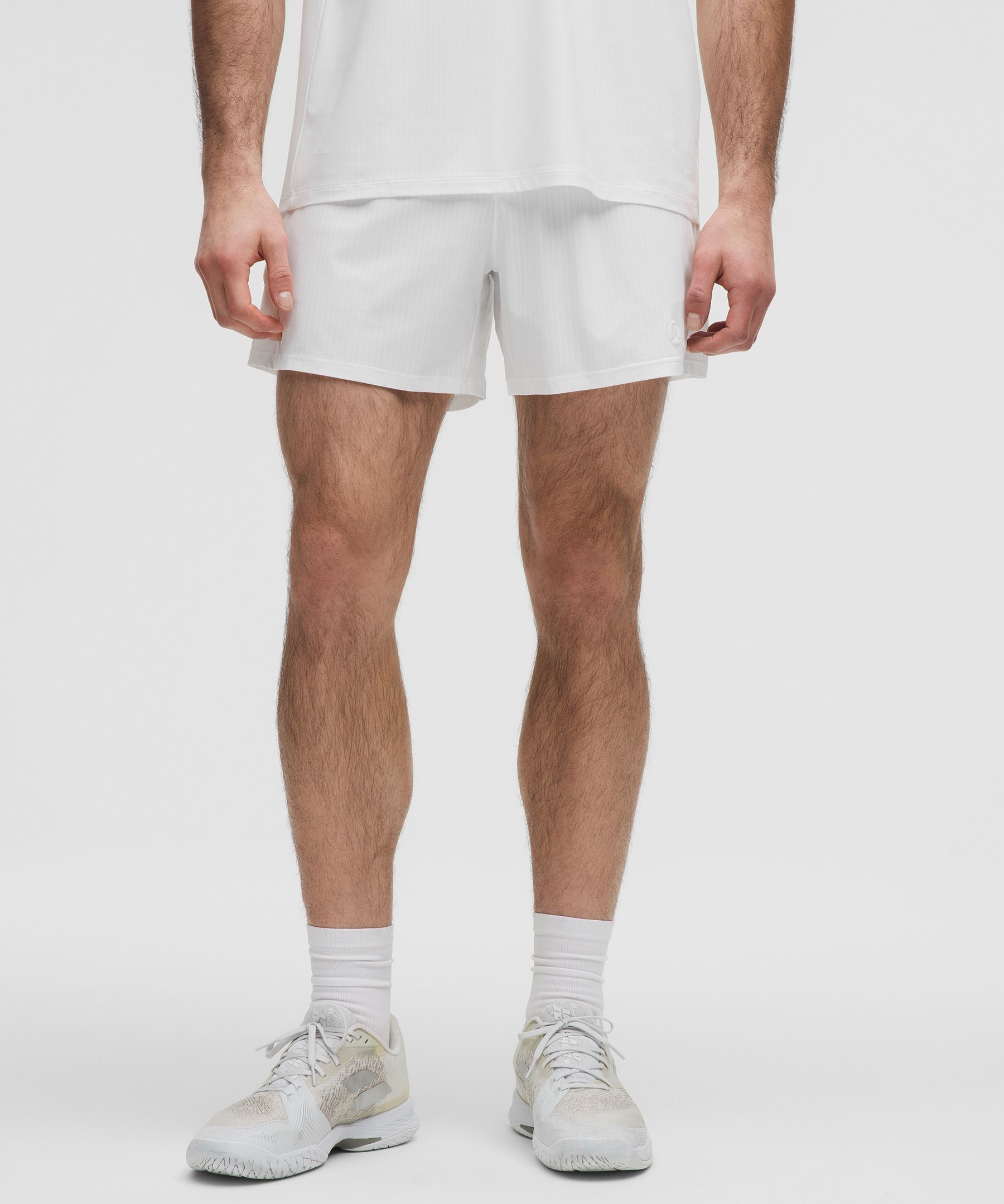 Breathable, Pocketed. Designed for Tennis. Streamlined fit that gives glutes and thighs breathing room. Keep your cool on the court. When racket sport season hits, these breathable striped mesh shorts wick away sweat and dry fast so you can focus on the game, not your gear. | lululemon – Men’s Striped Tennis Shorts – 5″ – Color White – Size XS
