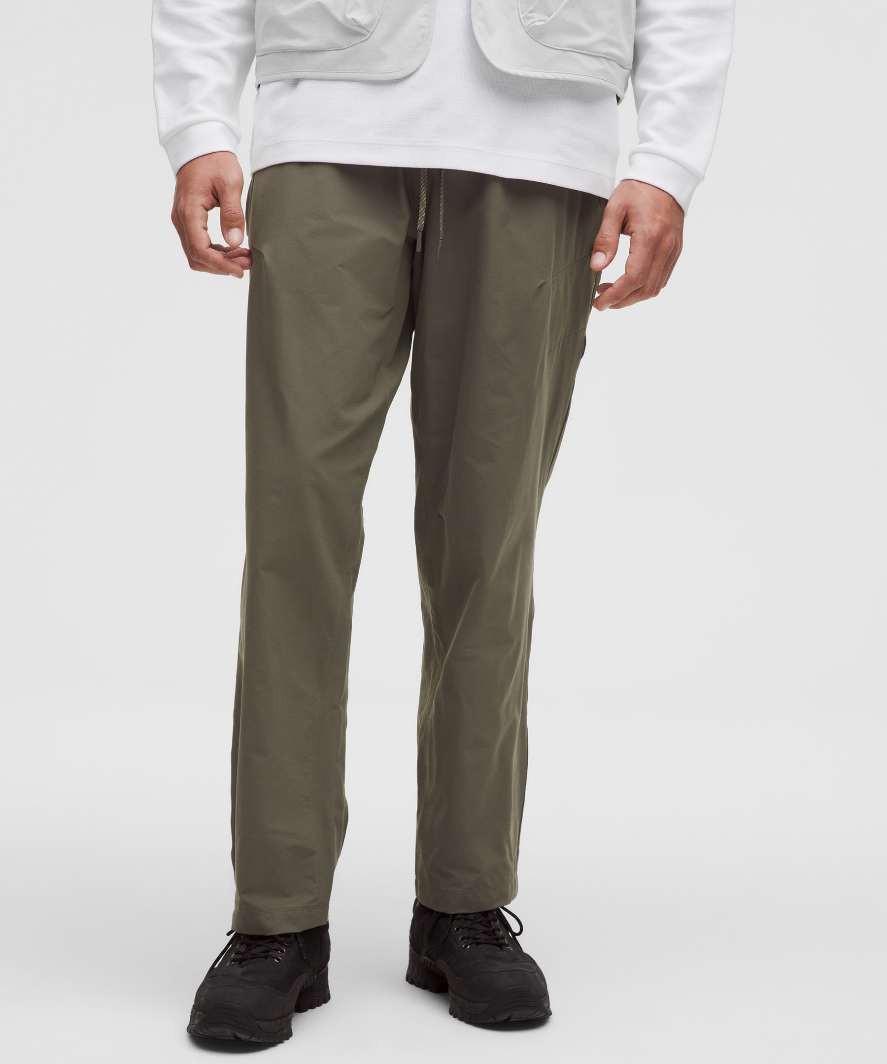 Water Resistant, Windproof, Drawstring, Pocketed. Designed for Hiking. Streamlined fit that gives glutes and thighs breathing room. Intended to sit at ankle for 32″-34″ inseam. Cut from water-resistant, windproof fabric, these UV-protective hiking pants help protect you from the elements whether you’re on the move or admiring the view. | lululemon – Men’s UV-Protective Hiking Trousers – Color Green – Size XS