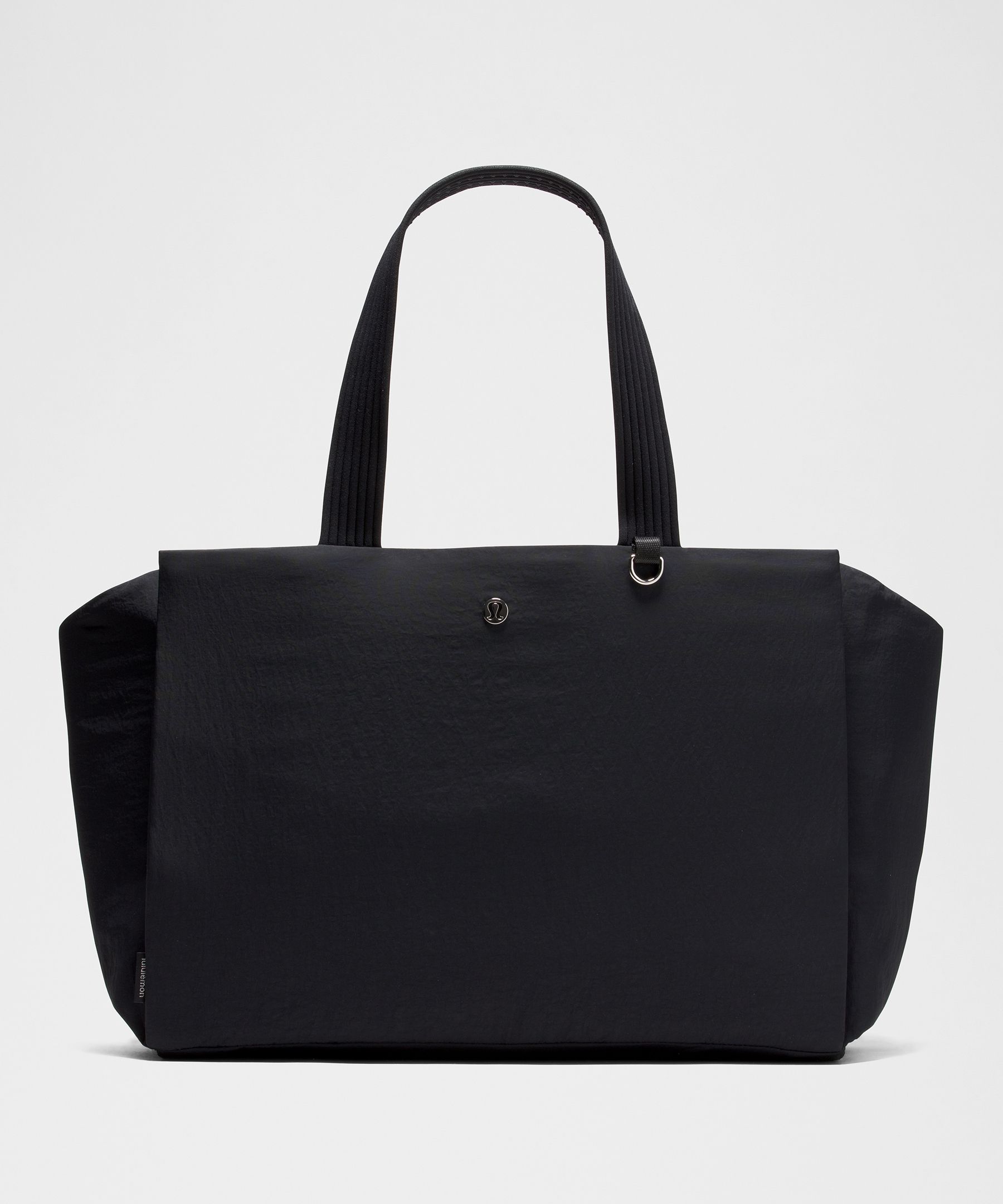 Water Repellant, Pocketed. Designed for Casual. Dimensions: W 42cm x D 15cm x H 30cm (16.5″ x 5.9″ x 11.8″). Volume: 18L. The wrap-around construction of this tote bag creates three separate zones. Slip your laptop into the padded front pocket and carry everything else in the other compartments. | lululemon – Triple Compartment Tote Bag 18L – Color Black