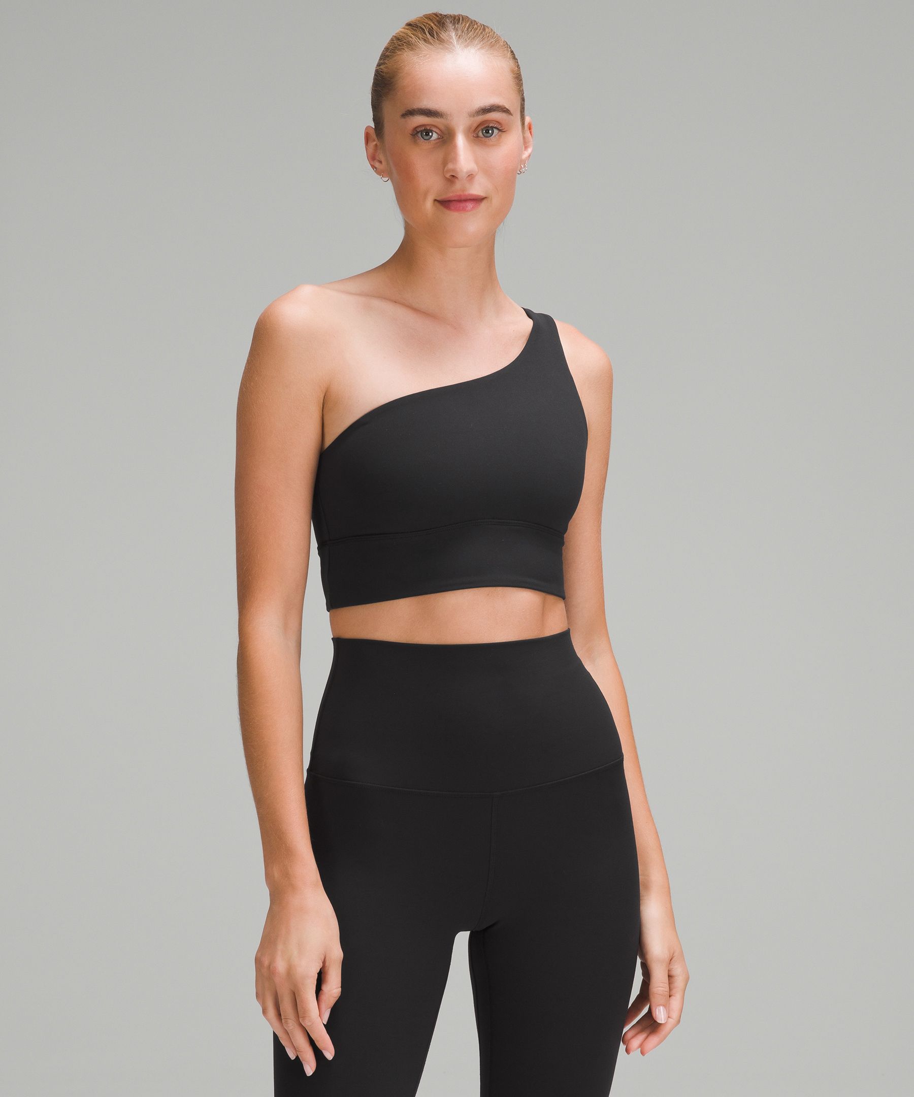 Designed for Yoga. Intended for low-impact activities. Feels (almost) as good as savasana. Powered by Nulu fabric, this version of the lululemon Align yoga bra wraps you in buttery softness and has one strap for an asymmetrical look. | lululemon – Women’s Align Asymmetrical Sports Bra Light Support, A/B Cup – Color Black – Size 18