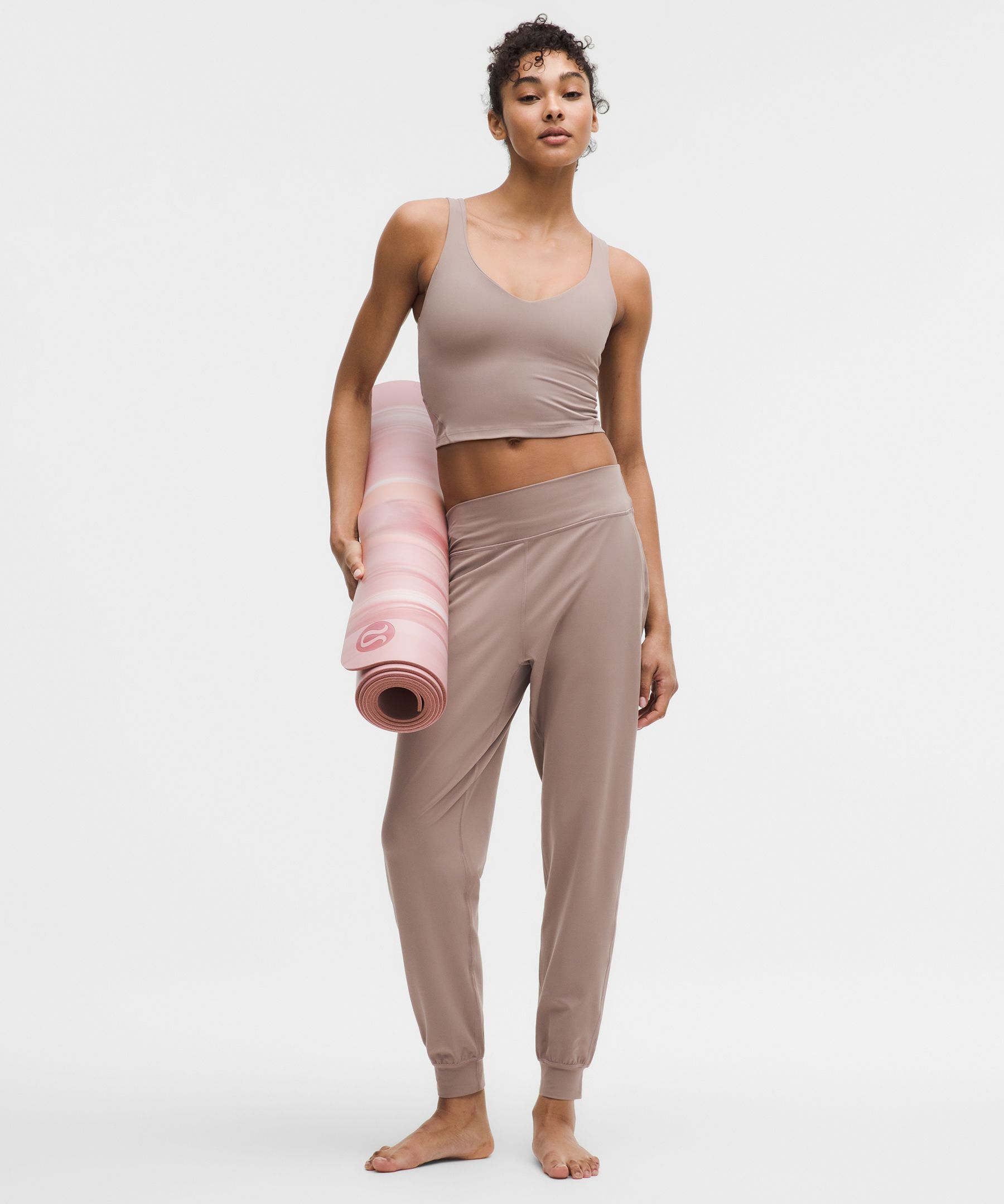 Lightweight, Pocketed. Designed for Yoga. Slim fit is streamlined with a little extra room in the seat, thighs, and legs to deliver that relaxed jogger look. Intended to sit at ankle for heights of 5’5″-5’8″. When feeling nothing is everything. We updated our buttery-soft lululemon Align joggers to give you that classic jogger look with a roomier fit, shorter cuffs, and discreet hand pockets. | lululemon – Women’s Align High-Rise Joggers Regular – Color Pink – Size 12
