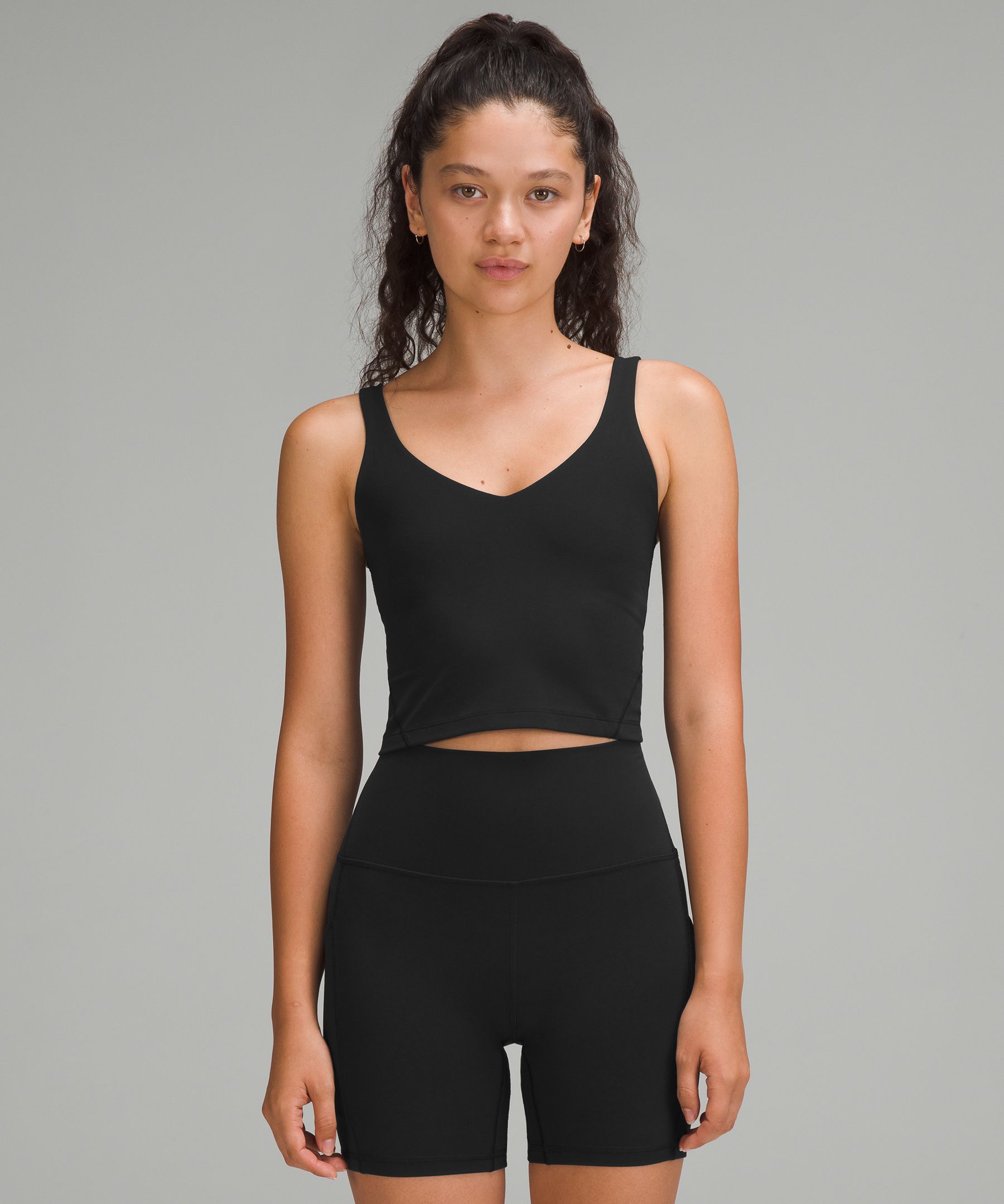 Shelf Bra, Lightweight. Designed for Yoga. Sizes 0-14 fit A/B cups. Sizes 16-20 fit C/D cups. Tight fit contours your body. Cropped length is cut above the waist-perfect with high-rise pants. Intended for low-impact activities. When feeling nothing is everything. The lululemon Align collection is so weightless and buttery soft, all you feel is your practice. | lululemon – Women’s Align Tank Top Light Support, A/B Cup – Color Black – Size 16