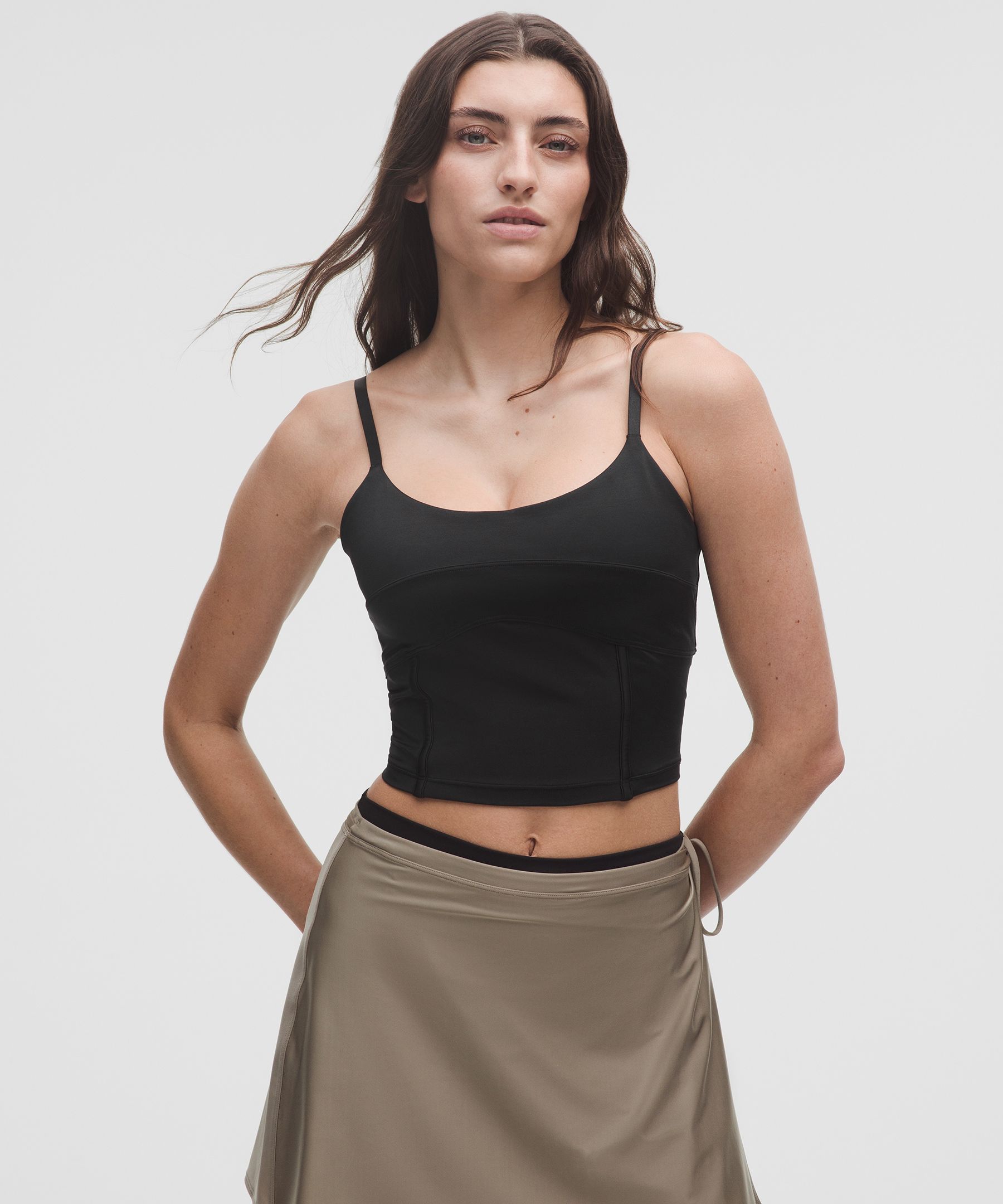 Shelf Bra. Designed for Yoga. Intended to provide light support for C/D cups. Tight fit contours your body. Cropped length is cut above the waist-perfect with high-rise pants. Intended for low-impact activities. Here’s to ten years of lululemon Align. This special edition features satiny panels and corsetry-inspired design lines with Align’s signature barely there feel. | lululemon – Women’s Align Tank Top Light Support, C/D Cup Satin – Color Black – Size 6