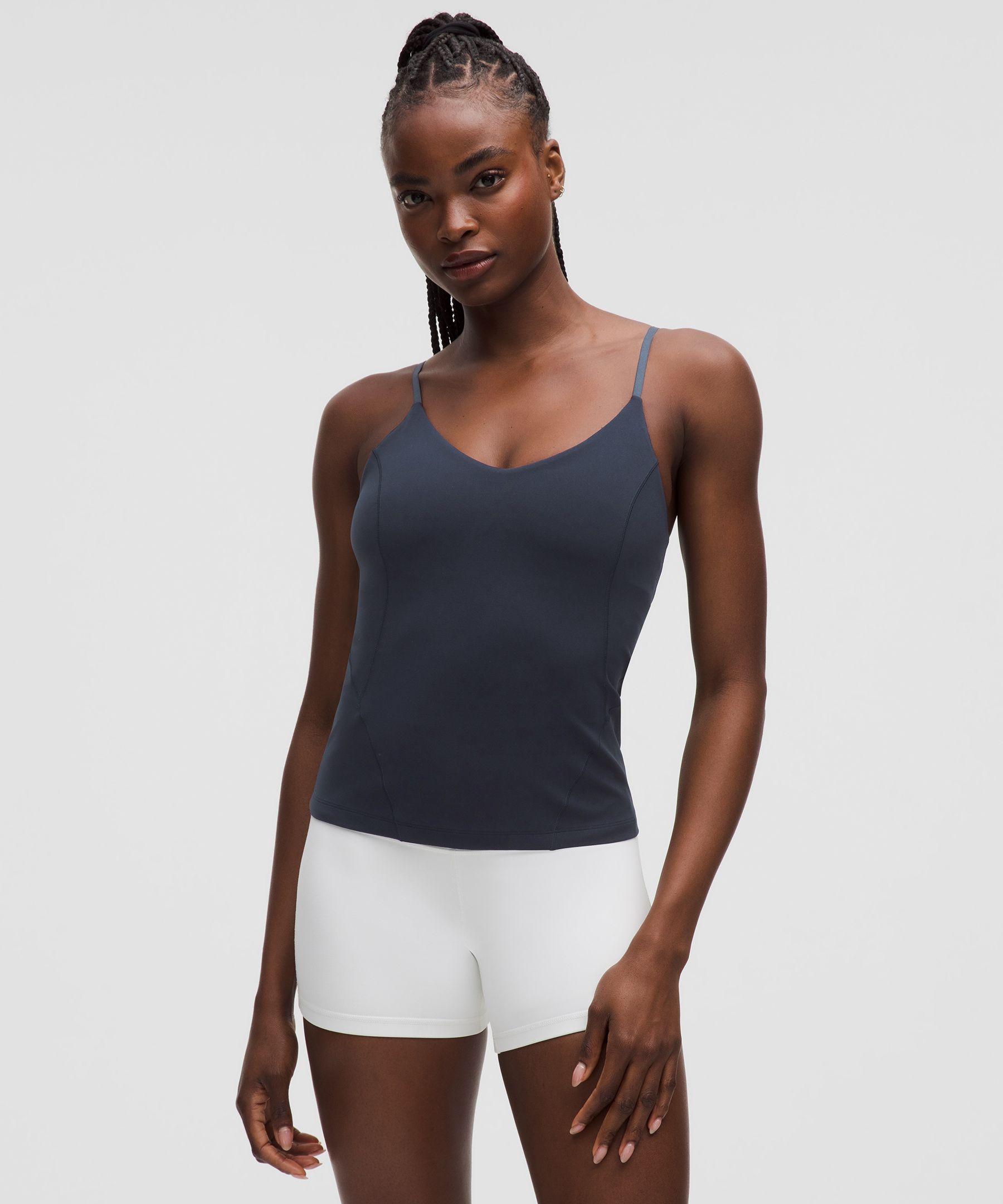 Shelf Bra. Designed for Yoga. Intended to provide light support for C/D cups. Tight fit contours your body. Waist length is not too short, not too long, just right around the waistband. Intended for low-impact activities. When feeling nothing is everything. Powered by Nulu fabric, this tank with cami-inspired adjustable straps is so weightless and buttery soft, all you feel is your practice. | lululemon – Women’s Align Waist-Length Cami Tank Top Light Support, C/D Cup – Color Blue – Size 18