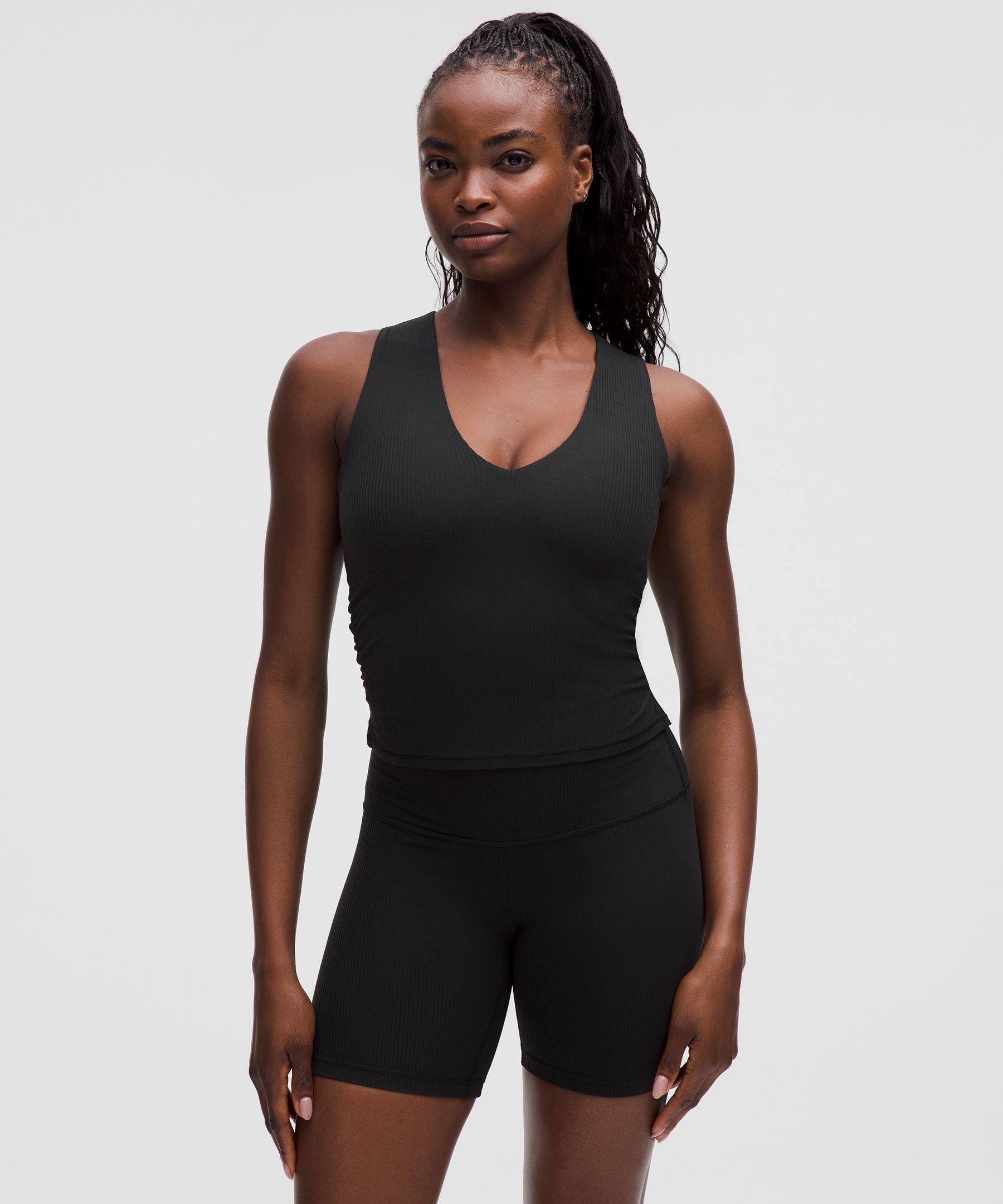 Shelf Bra. Designed for Yoga. Intended to provide light support for B-D cups. Slim fit skims your body. Waist length is not too short, not too long, just right around the waistband. Intended for low-impact activities. Performance meets elegance in this v-neck tank top. Buttery-soft fabric moves with you, a built-in shelf gives gentle support, and cinched sides contour your curves. | lululemon – Women’s All It Takes V-Neck Tank Top Light Support, B-D Cup Ribbed Nulu – Color Black – Size 4
