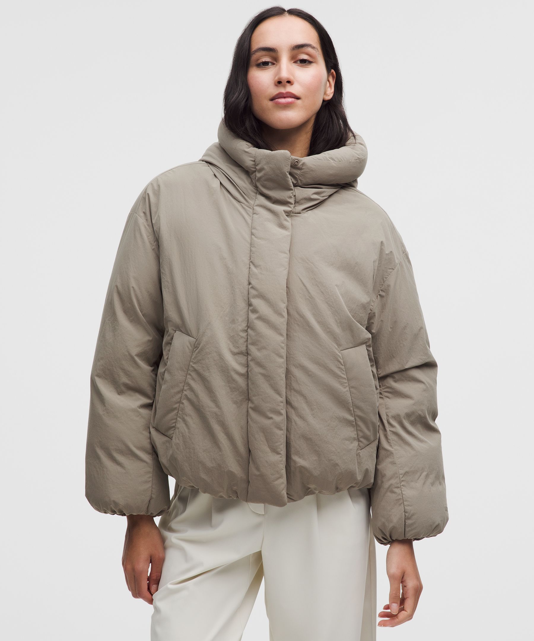 Down, Pocketed, Water Resistant, Windproof. Designed for Casual. Oversized fit is purposefully large with exaggerated proportions. Size down if you prefer a slimmer fit. Bundle up in a bubble of warmth. The playful cinched hem on this down-filled jacket helps to hold heat in and keep cold weather out. | lululemon – Women’s Bubble-Hem 600-Down-Fill Puffer Jacket – Color Grey/Khaki – Size XL