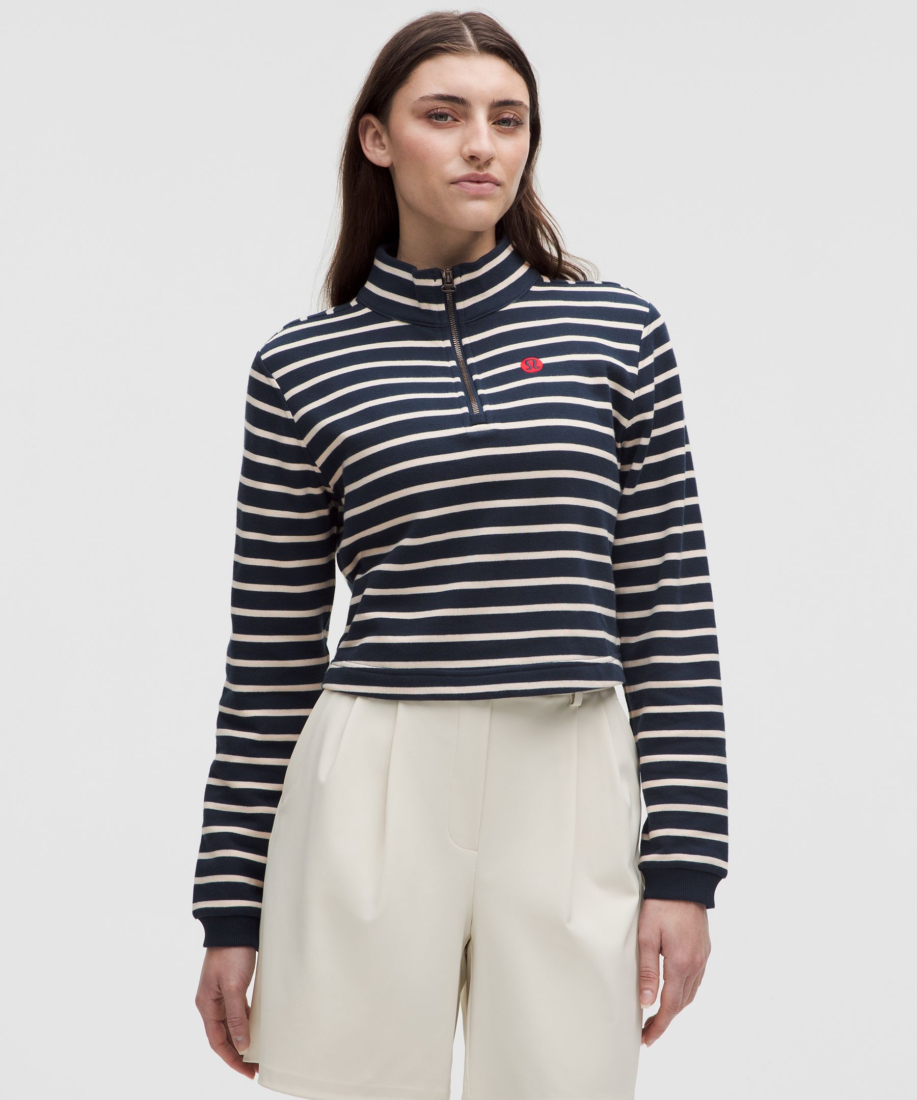 Lightweight. Designed for Casual. An easy fit that floats away from your body. Not too short, not too long, just right around the waistband. Cut for a classic put-together look, this lightweight, breathable French terry half zip is in a league of its own. | lululemon – Women’s Cotton French Terry Cropped Half Zip Sweatshirt – Color Blue – Size XL