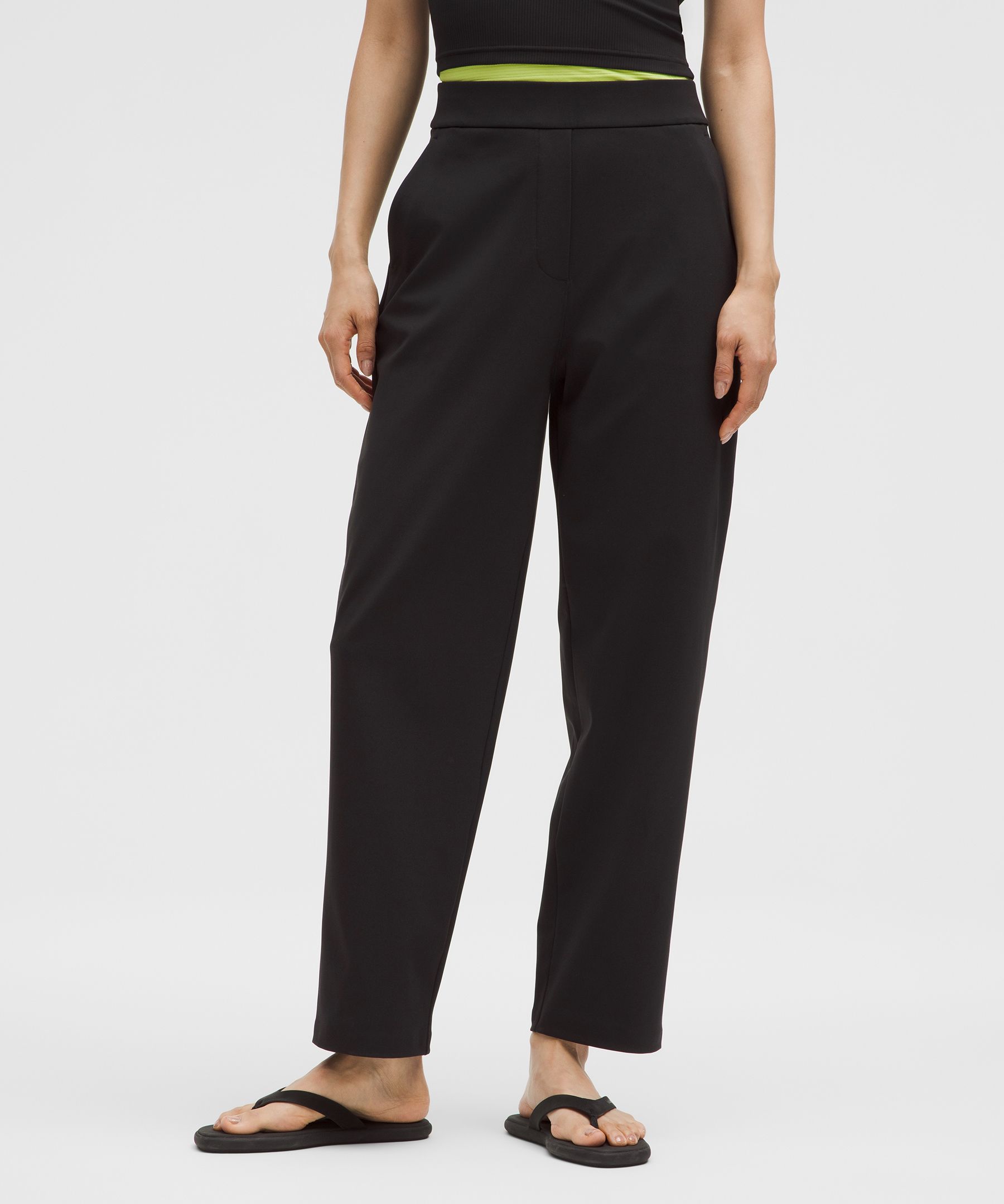 Pocketed, Drawstring. Designed for Casual. Classic fit is an easy fit that floats away from your body. Tapered from knee to hem. 25″ inseam, intended to sit at ankle for 5’4″ and under. Technical meets tailored. These tapered pants feature classic design touches and use four-way stretch Luxtreme fabric for a powerfully sleek look and feel. | lululemon – Women’s Daydrift High-Rise Tapered Trousers Short – Color Black – Size Small