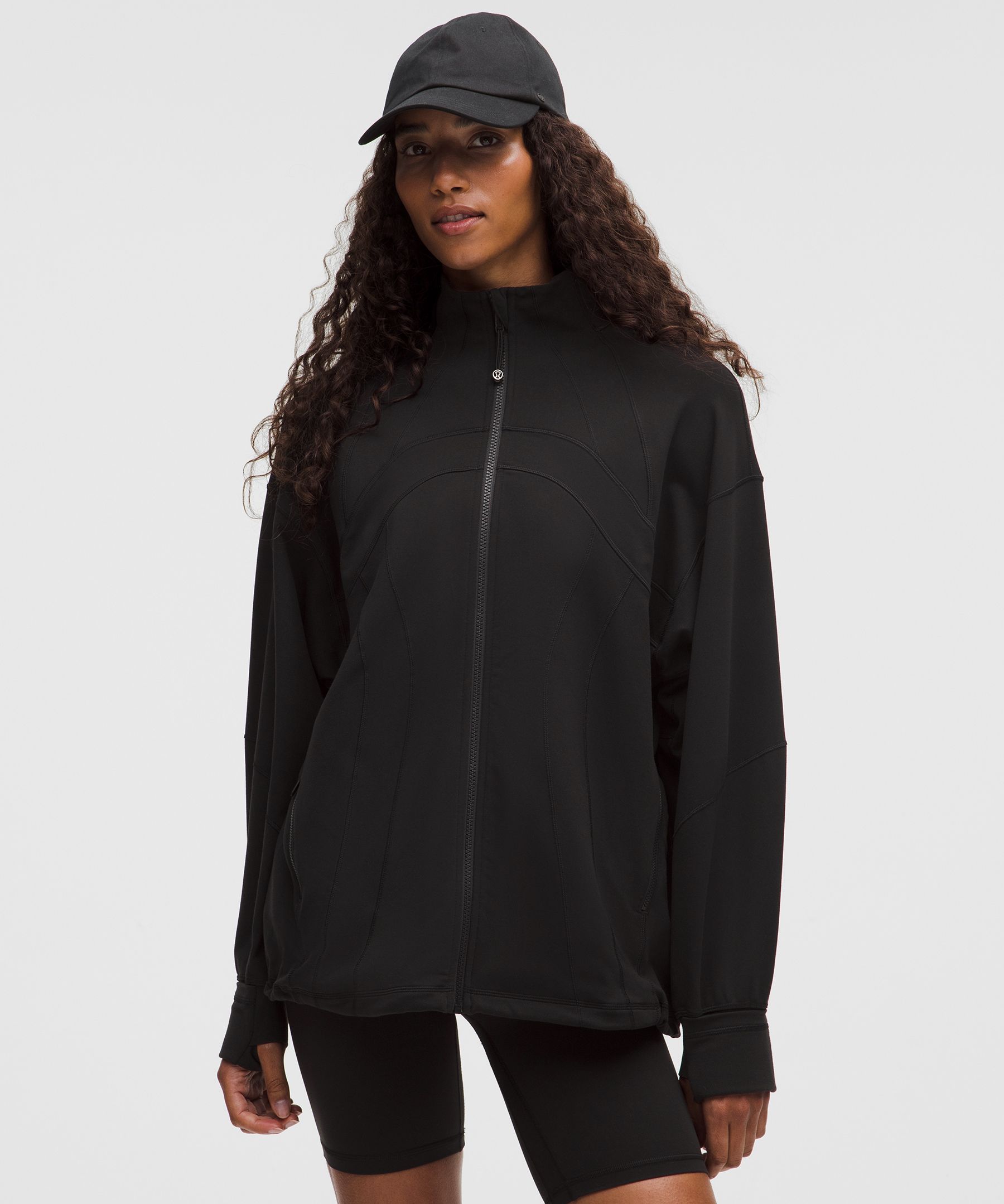 Drawstring, Pocketed, Thumbholes. Designed for Casual. An exaggerated fit that feels extra roomy. Long length keeps bum and hips covered. Defined, but keeps them guessing. This version of our fan-favourite jacket has an oversized fit and a cinchable shockcord hem that lets you switch up the shape and length. | lululemon – Women’s Define Oversized Jacket Luon – Color Black – Size 4