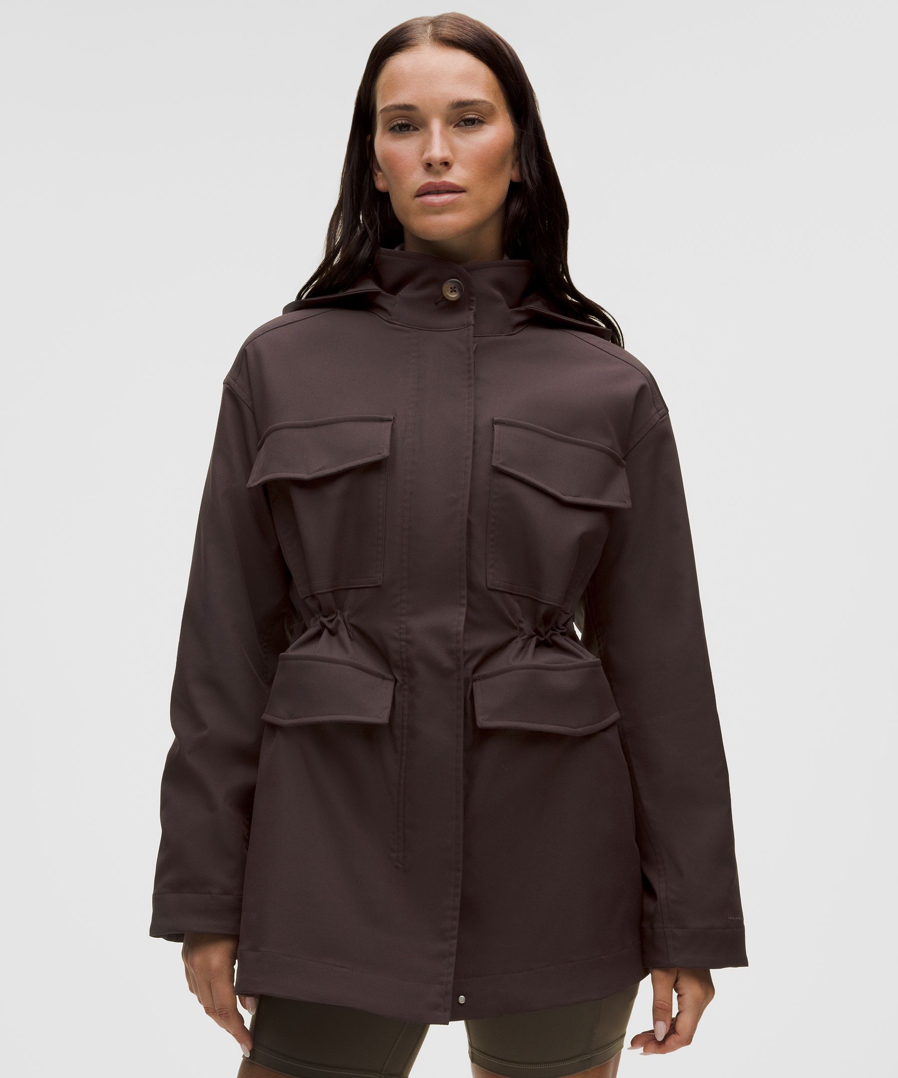 Pocketed, Water Resistant. Designed for Casual. Oversized fit is purposefully large with exaggerated proportions. Size down if you prefer a slimmer fit. Handles wind, rain, and lengthy to-do lists. Made from water-resistant technical canvas and packed with practical pockets, this jacket is an everyday all star. | lululemon – Women’s DryField Utility Jacket – Color Brown – Size XS