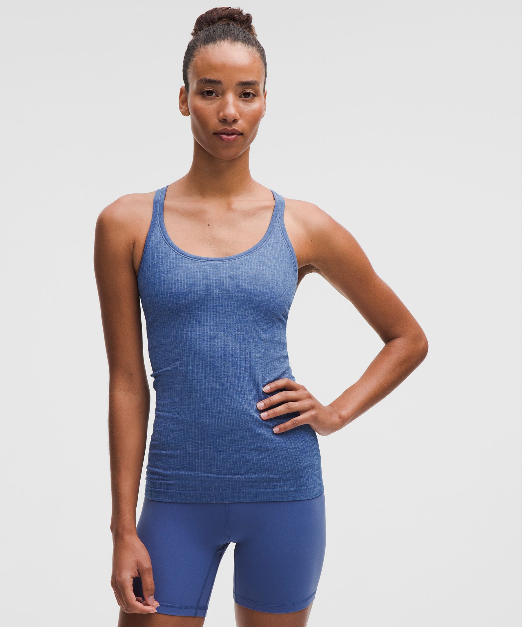 Shelf Bra, Seamless. Designed for Yoga. Intended to provide light support for B/C cups. Slim fit skims your body. Hip length sits below the waistband for moderate, everyday coverage. Intended for low-impact activities. Seamless support. This one-and-done yoga tank is made using our seamless construction for a smooth fit and features built-in support for a fuss-free practice. | lululemon – Women’s Ebb to Street Tank Top Light Support, B/C Cup – Color Blue – Size 8