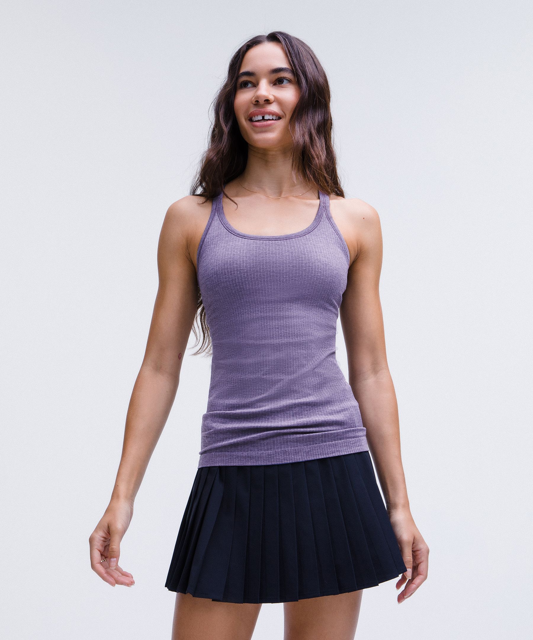 Shelf Bra, Seamless. Designed for Yoga. Intended to provide light support for B/C cups. Slim fit skims your body. Hip length sits below the waistband for moderate, everyday coverage. Intended for low-impact activities. Seamless support. This one-and-done yoga tank is made using our seamless construction for a smooth fit and features built-in support for a fuss-free practice. | lululemon – Women’s Ebb to Street Tank Top Light Support, B/C Cup – Color Purple – Size 18
