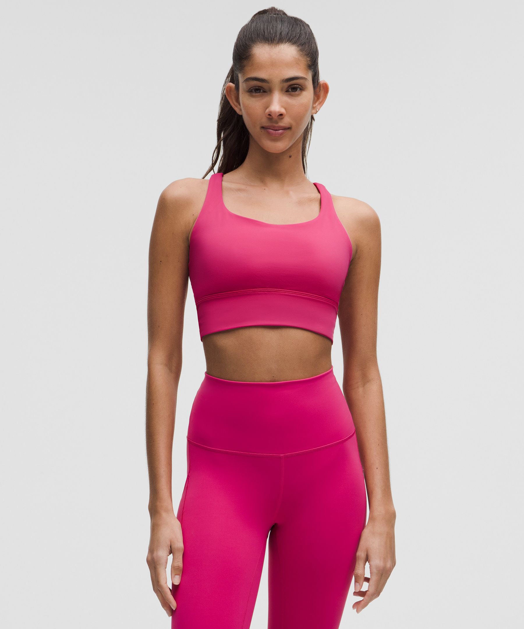 Designed for Yoga and Training. Intended for medium-impact activities. Voted most likely to be worn multiple times a week. This all-sport bra is a favourite for comfort and versatility. | lululemon – Women’s Energy Longline Sports Bra Medium Support, B-D Cups – Color Pink – Size 6