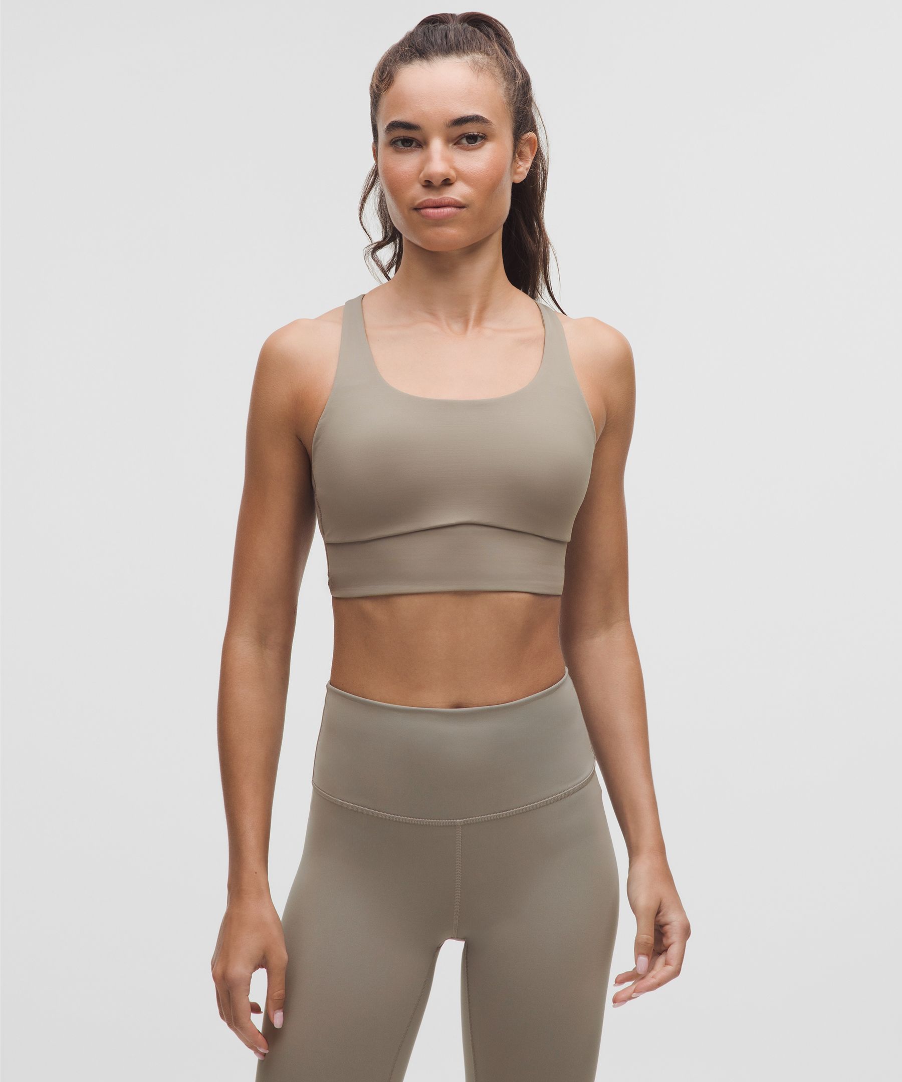 Designed for Yoga and Training. Intended for medium-impact activities. Medium support that doesn’t feel restrictive. Your built-in support system. This versatile sports bra has a strappy back design and a comfortably supportive fit for all the ways you love to move. | lululemon – Women’s Energy Longline Sports Bra Medium Support, B-D Cups Evolve – Color Grey/Khaki – Size 6