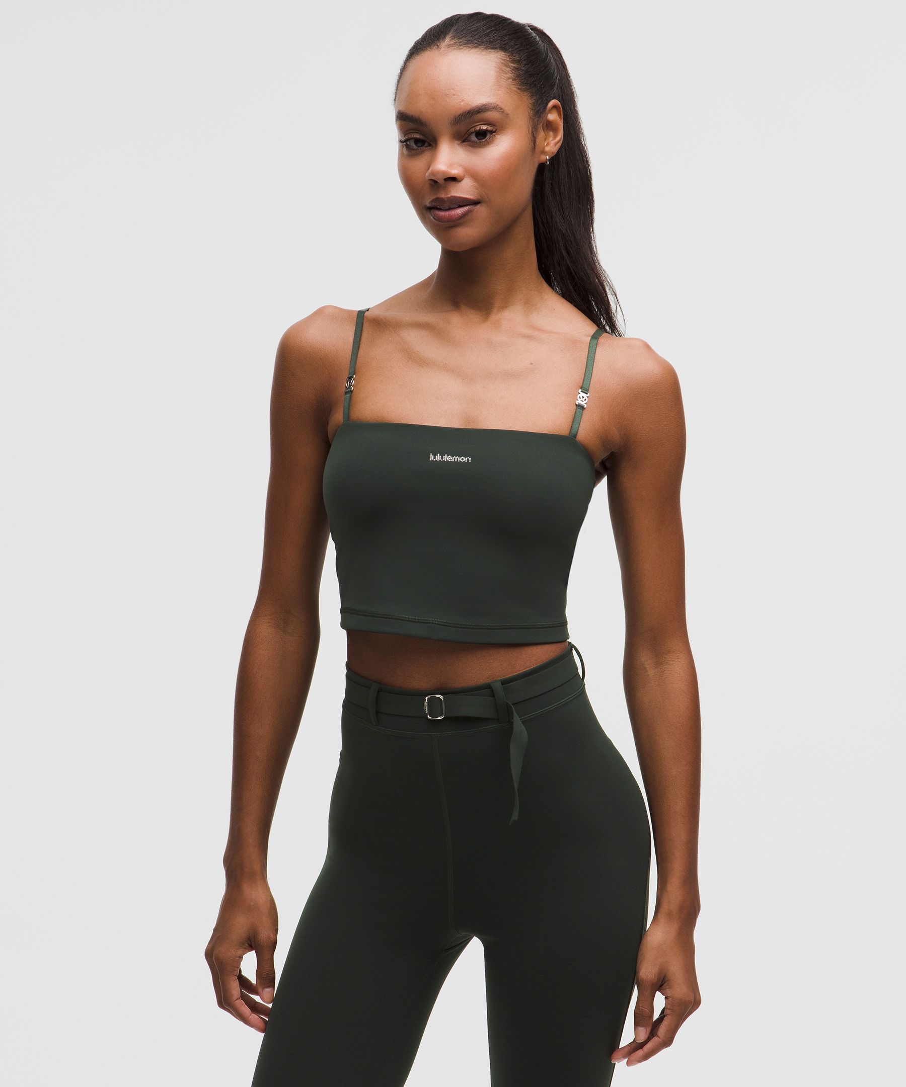 Designed for Training and Pilates. Intended to provide light support for A/B cups. Tight fit contours your body. Cropped length is cut above the waist-perfect with high-rise pants. Intended for low-impact activities. A play on Y2K. With charm details and a rhinestone wordmark, this Everlux tank makes your studio look sparkle. | lululemon – Women’s Everlux Cropped Cami Tank Top A/B Cup – Color Green – Size Small