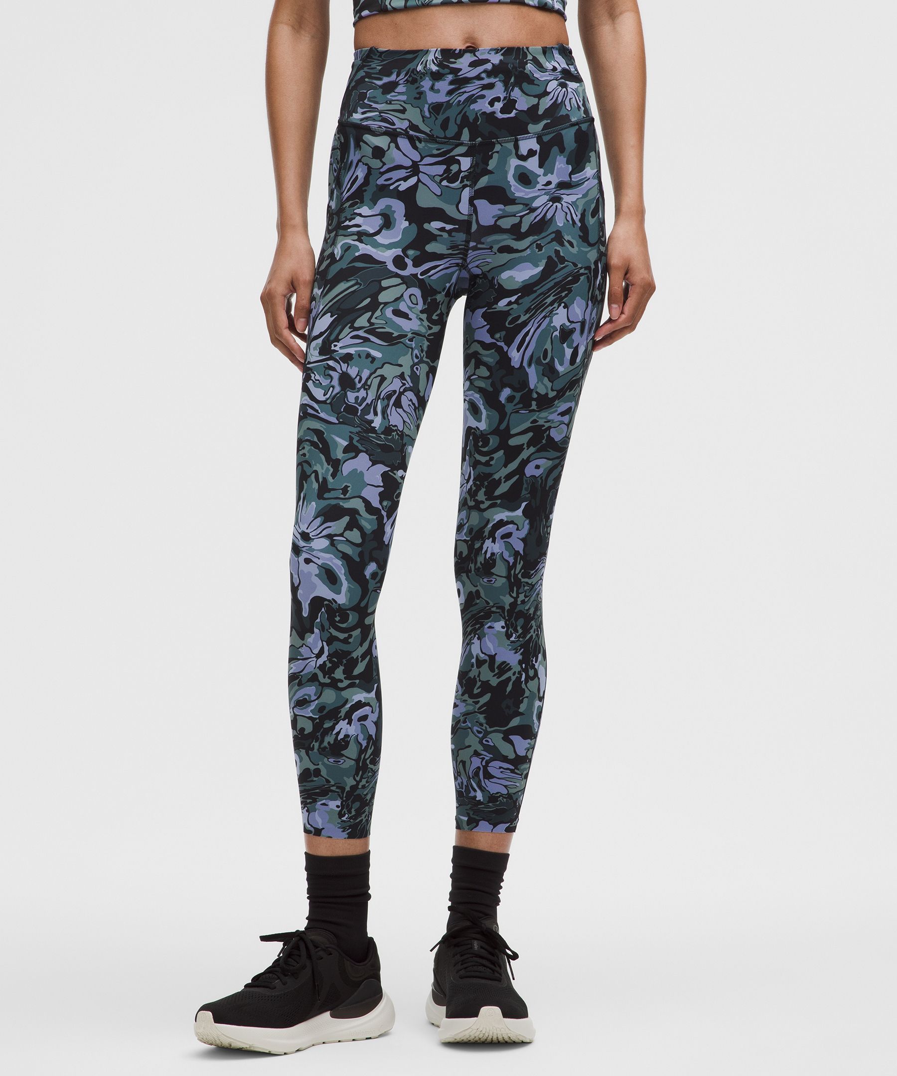 Reflective, Drawstring, Pocketed, Lightweight, Seamless. Designed for Running. Intended to sit above ankle. Set your run free. This five-pocket version of our Fast and Free tight has seam-free inner thighs and a streamlined waistband to maximize that smooth, weightless feeling. | lululemon – Women’s Fast and Free High-Rise Tight Leggings 5 Pocket – 25″ – Color Printed – Size 8