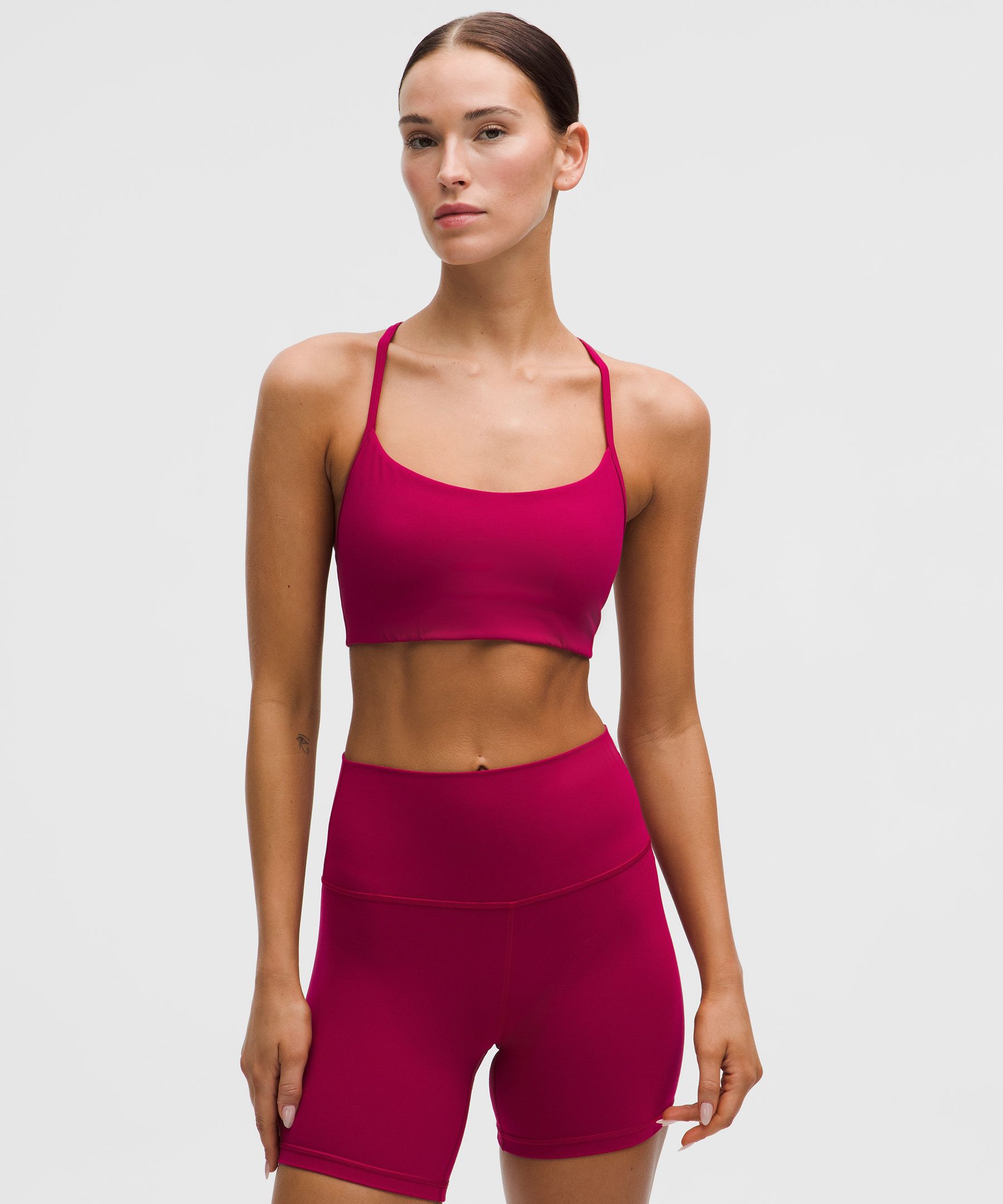 Designed for Yoga and Pilates. Intended for low-impact activities. Soft support, refined design. Minimal seams and our famously soft Nulu fabric create a lightweight bra that delivers optimal comfort with a minimalist look. | lululemon – Women’s Flow Y Sports Bra Light Support, A/B Cup Evolve – Color Pink – Size XS