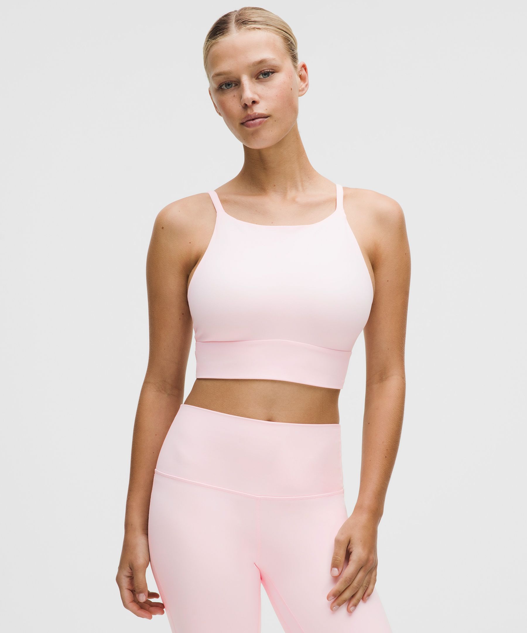Designed for Yoga and Pilates. Intended for low-impact activities. That savasana feeling. We designed this strappy bra to deliver comfortable support with a light-as-air feel and a natural shape so you feel your best during yoga, low-impact classes, and on rest days. | lululemon – Women’s Focuser High-Neck Sports Bra Light Support, C/D Cup – Color Pink – Size Small