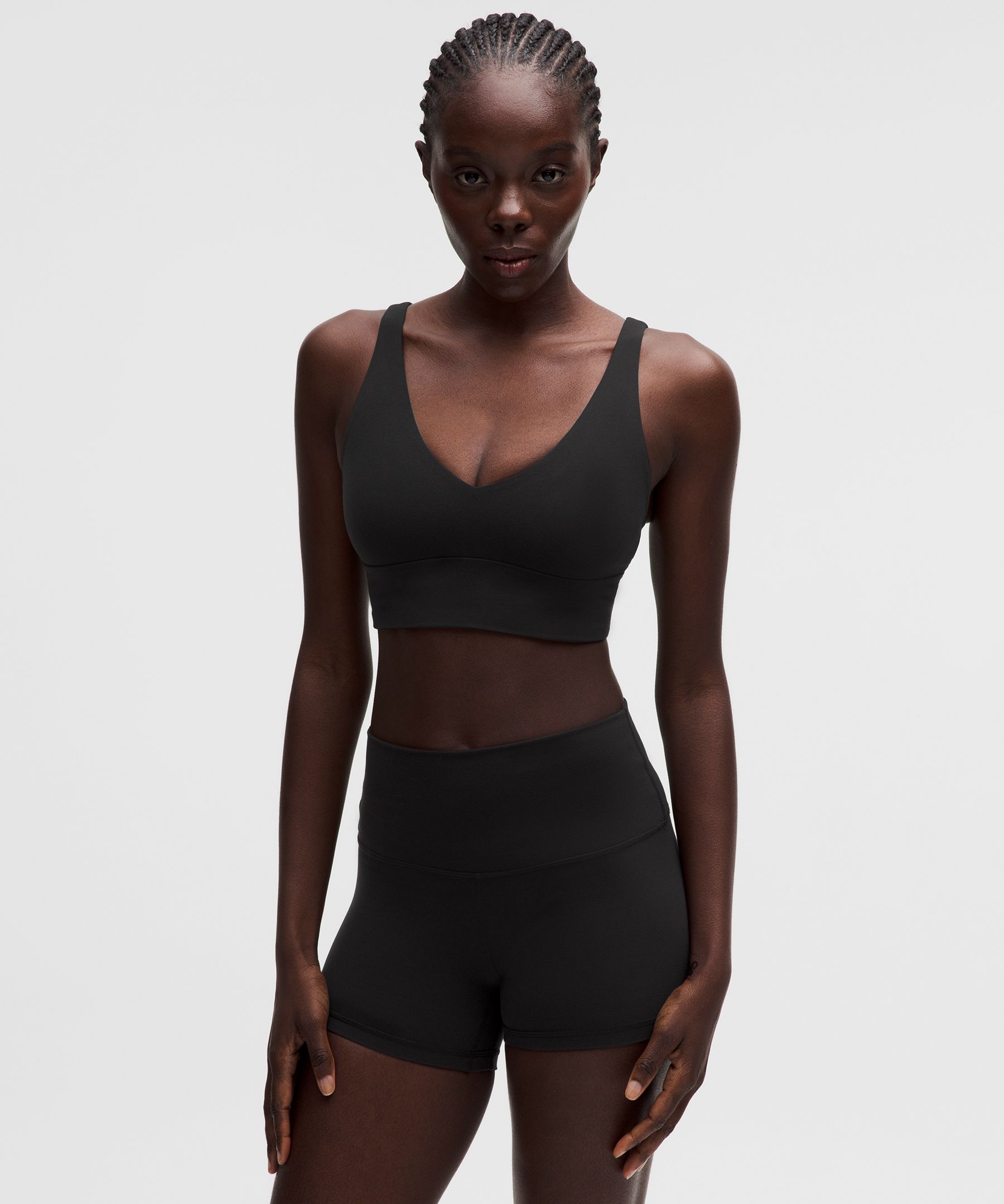 Lightweight. Designed for Yoga and Pilates. Intended for low-impact activities. That savasana feeling. We designed this v-neck bra to deliver comfortable support with a light-as-air feel and a natural shape so you feel your best during yoga, low-impact classes, and on rest days. | lululemon – Women’s Focuser V-Neck Sports Bra Light Support, A/B Cup – Color Black – Size Small