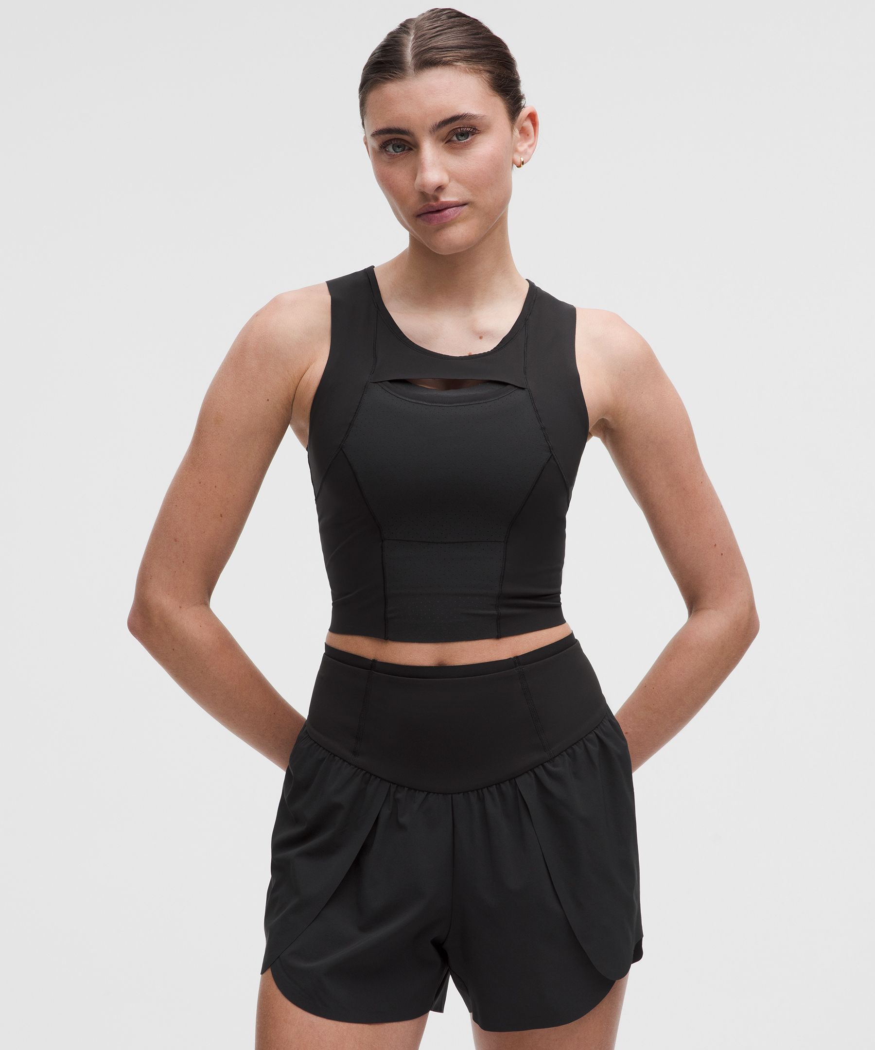 Designed for Running. Contours your body. Cut above the waist-perfect with high-rise pants. Designed for the unmet needs of female runners. Tested over 2,880 miles. This tank has low-profile ice storage and smooth-cut fabric for cool comfort on endurance runs. | lululemon – Women’s Go Further Ice Storage Tank Top – Color Black – Size 12