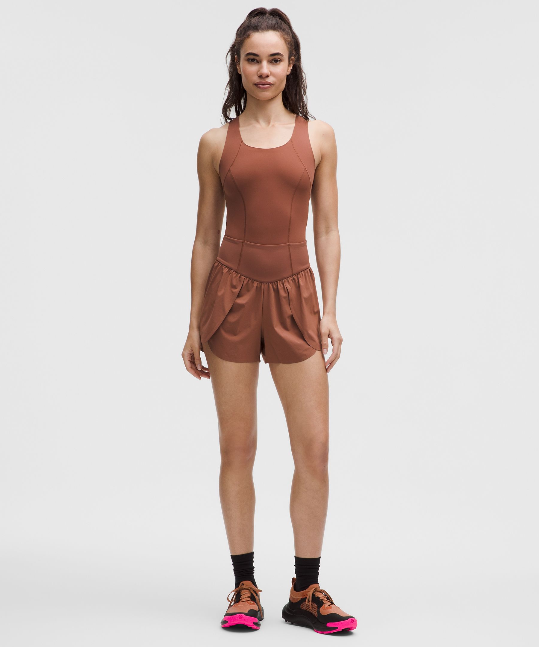 Pocketed. Designed for Running. Tight fit up top and classic fit on the bottom. Designed for the unmet needs of female runners. Tested over 2,880 miles. This smooth-cut one piece is equipped with 360° waistband storage for stashing keys, cards, water, and gels while on endurance runs. | lululemon – Women’s Go Further Split-Short Runsie – 3″ – Color Brown – Size 18