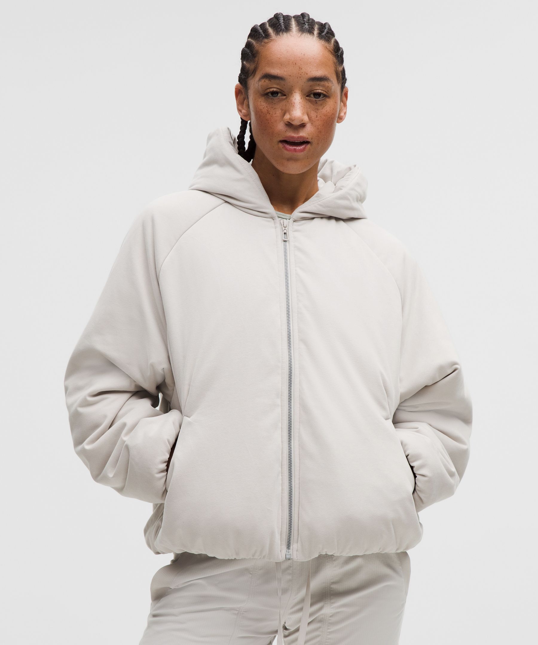Designed for Casual. An exaggerated fit that feels extra roomy. Sits below the waistband for moderate, everyday coverage. Off-duty, on-trend. Filled with insulating PrimaLoft and finished with a bubble hem, this cotton jersey hoodie serves up lightweight warmth in a laidback style. | lululemon – Women’s Insulated Full-Zip Hoodie – Color Grey/White – Size Large