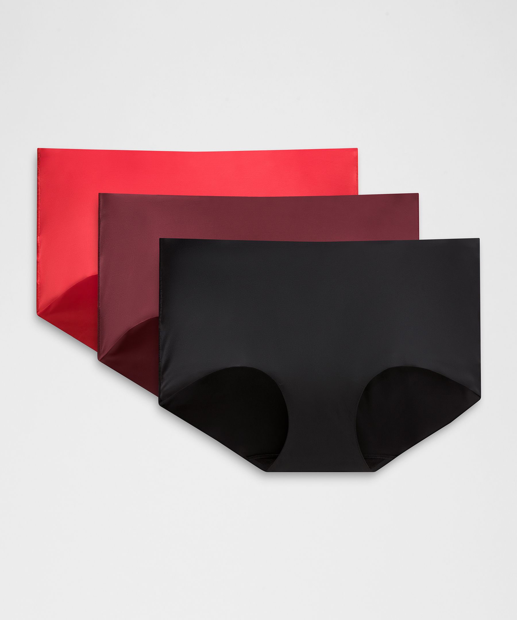 Multipack. Designed for Yoga and Casual. Wide front panel for coverage. Intended to sit about an inch below our mid-rise shorts, crops, pants, and leggings. Nothing to see here. Virtually undetectable underneath your leggings, these smooth underwear have a comfortable fit that doesn’t slip or slide. | lululemon – Women’s InvisiWear Mid-Rise Boyshort Underwear 3 Pack – Color Black/Red/Burgundy – Size Large