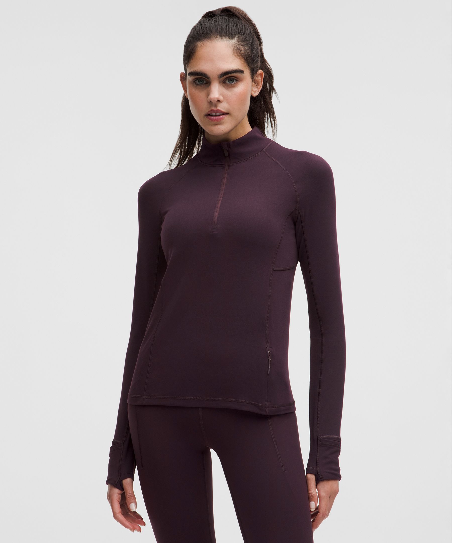 Pocketed, Thumbholes, Reflective. Designed for Running. An easy fit that floats away from your body. Sits below the waistband for moderate, everyday coverage. Warm up to cold-weather workouts. This soft half zip wicks away sweat so you can stay comfortable when the temperature drops. | lululemon – Women’s It’s Rulu Classic-Fit Half Zip Long-Sleeve Top – Color Black/Purple – Size 3XS