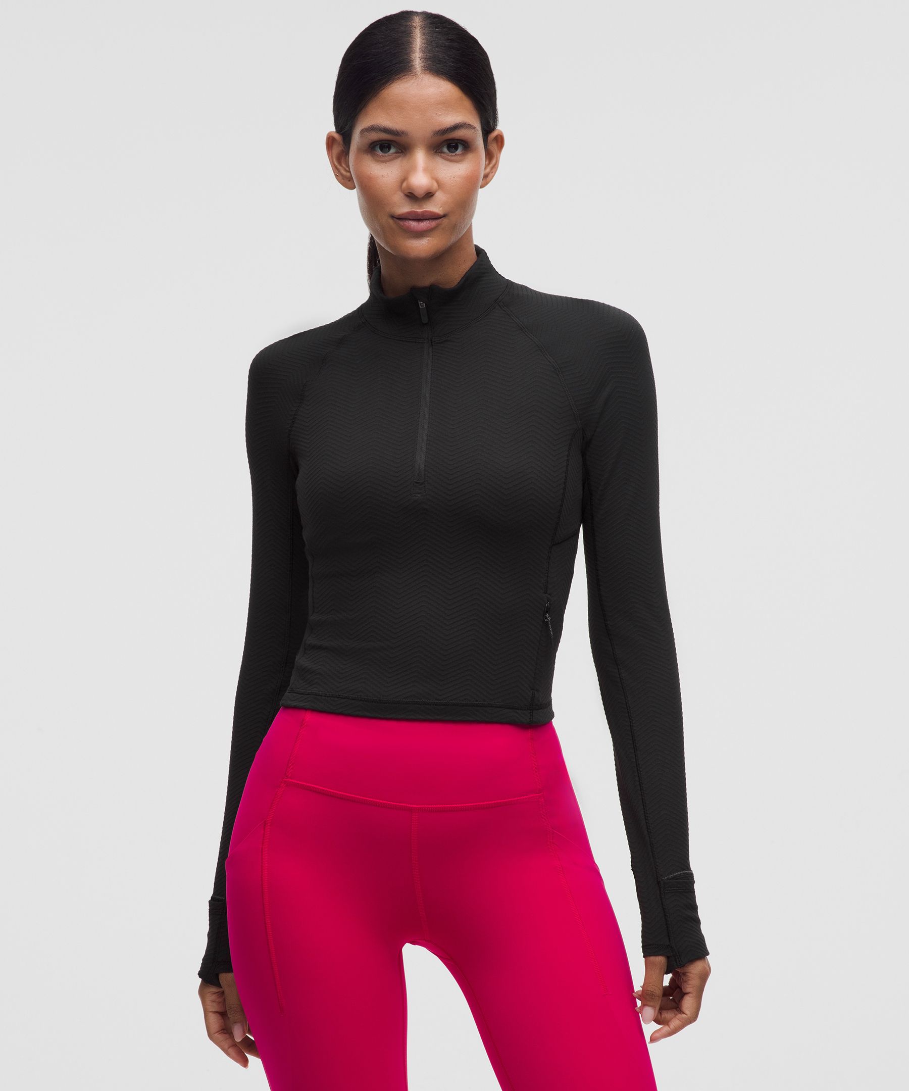 Designed for Running. Skims your body. Cut above the waist-perfect with high-rise pants. Warm up to cold-weather workouts. This soft half zip wicks away sweat so you can stay comfortable when the temperature drops. | lululemon – Women’s It’s Rulu Cropped Half Zip Long-Sleeve Top Chevron – Color Black – Size XL