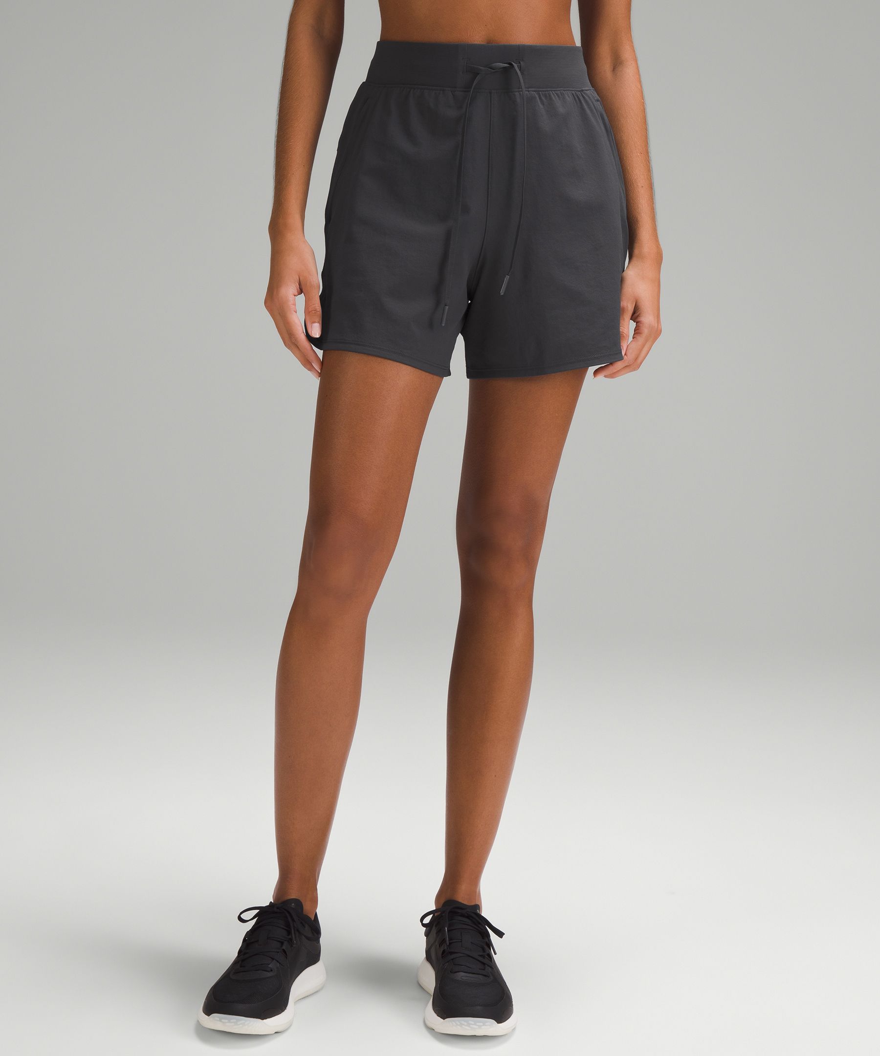 Drawstring, Pocketed. Designed for Training. Relaxed fit is roomy through glutes and thighs. Train hard, don’t hold back. The abrasion-resistant fabric on these shorts can handle burpees and barbells while the relaxed fit gives you full freedom to move. | lululemon – Women’s License to Train High-Rise Shorts – 4″ – Color Grey – Size 18