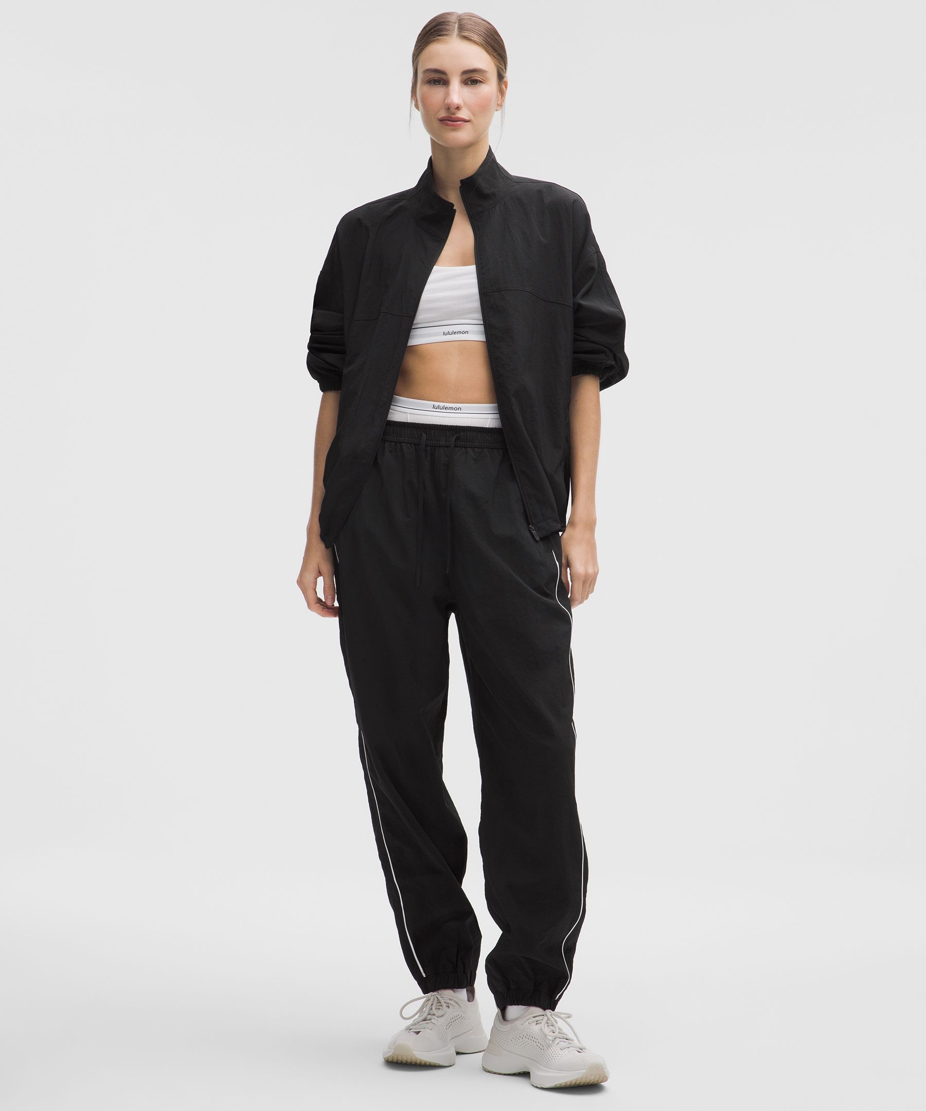 Drawstring, Lightweight, Pocketed. Designed for Training. Relaxed fit is roomy through glutes and thighs. Tapered from knee to hem. We cranked up the volume, you crank up the intensity. These lightweight joggers have a relaxed silhouette that makes layering over shorts or tights a breeze. | lululemon – Women’s License to Train Woven Mid-Rise Joggers – Color Black/White – Size Large