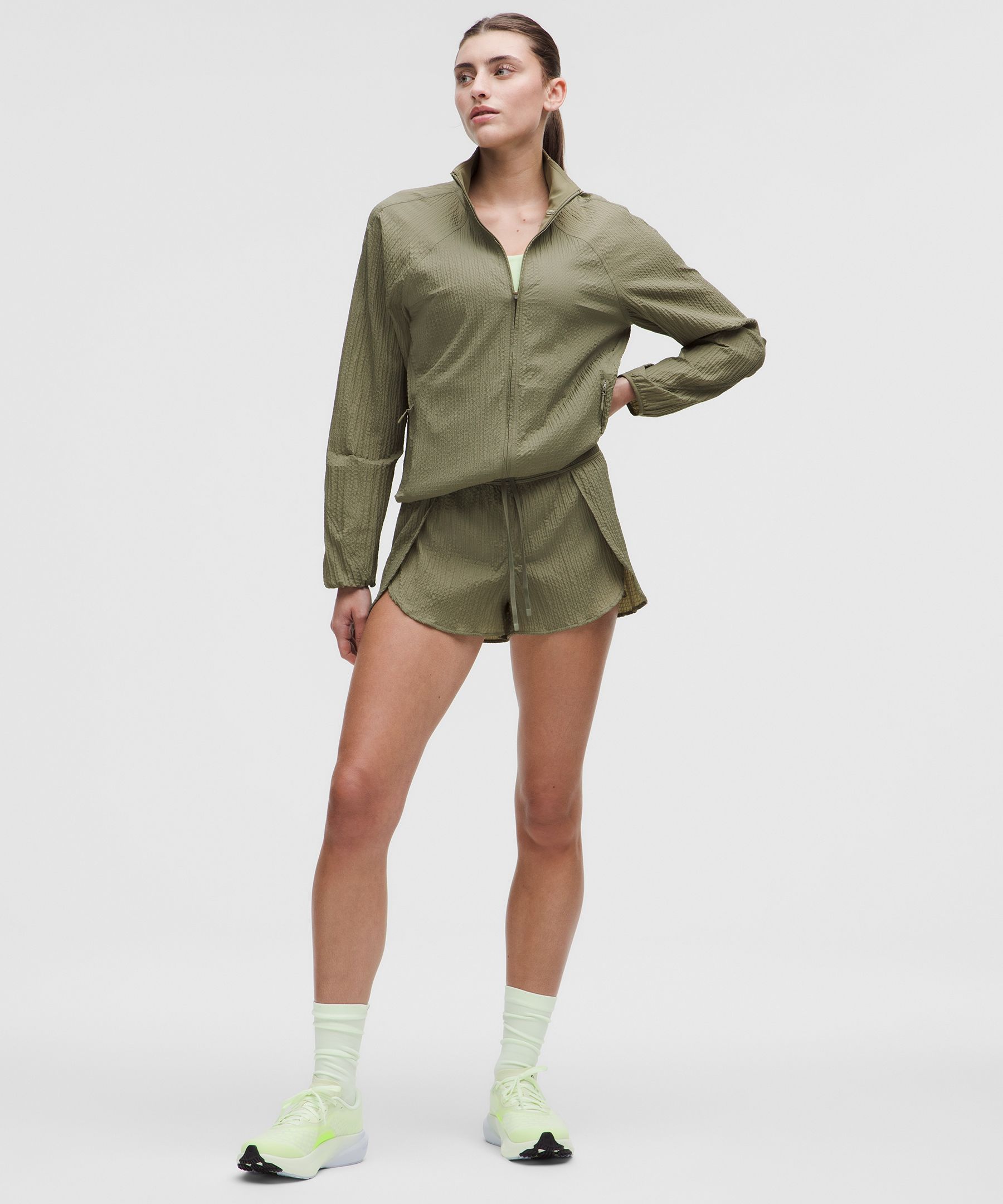Drawstring, Lightweight, Lined. Designed for Running. A sucker for speed. These lightweight shorts are made from an ultralight seersucker fabric that splits at the front for maximum mobility. | lululemon – Women’s Negative Split Textured Run Shorts – 2.5″ – Color Green – Size XS