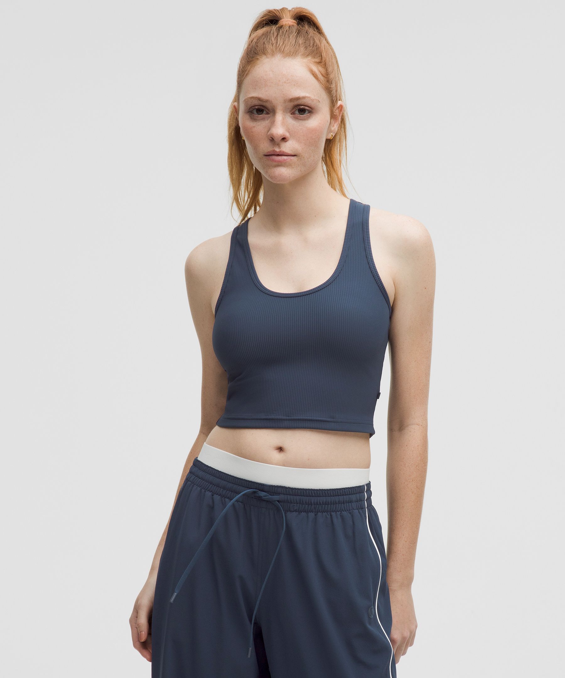 Reversible. Designed for Training. Contours your body. Cut above the waist-perfect with high-rise pants. One tank, two looks. Cut from our sleek ribbed Luxtreme fabric, this classic scoop-neck can be turned around for an edgy, racer-front look. | lululemon – Women’s Power Pivot Training Tank Top – Color Blue – Size Large