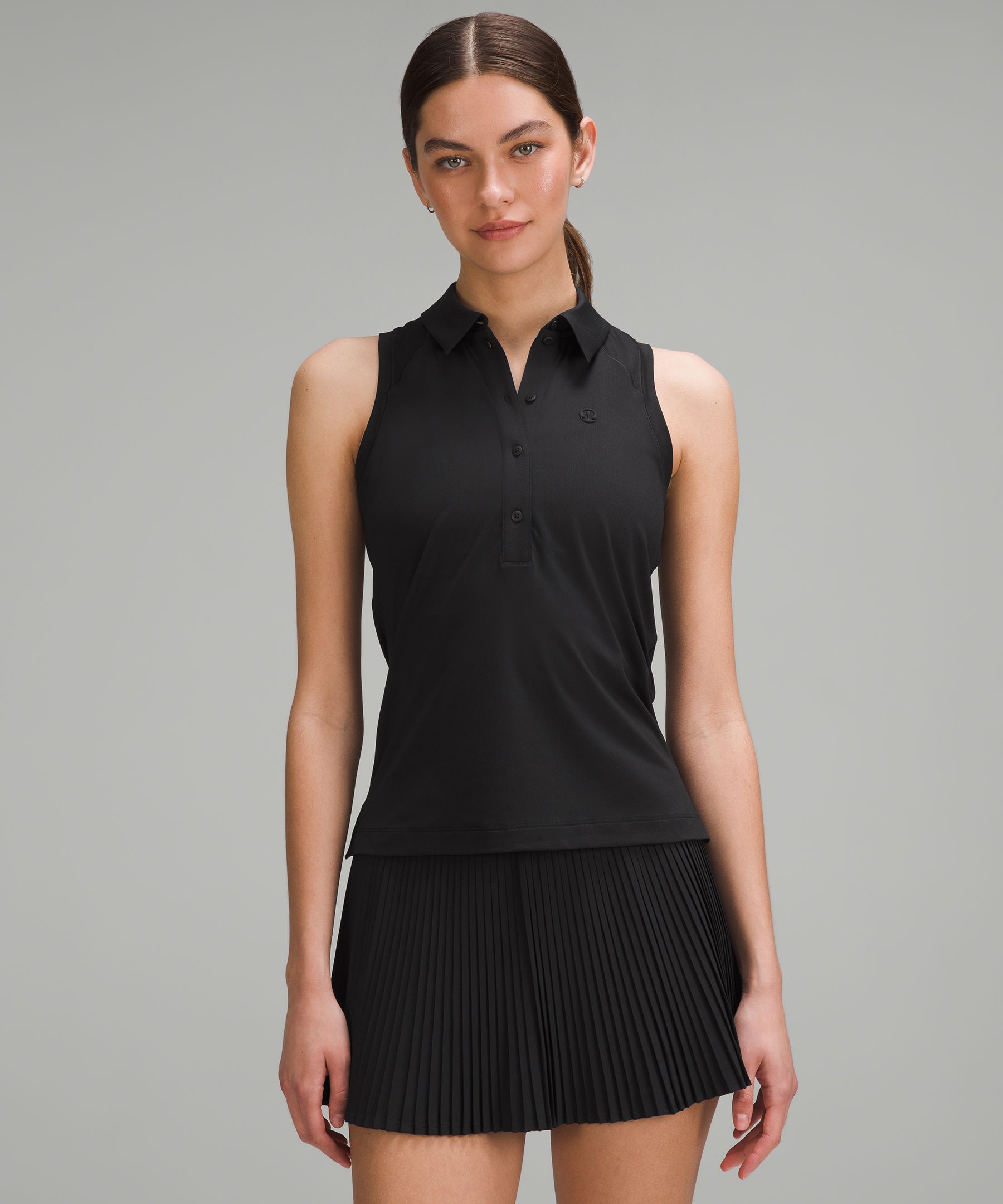 Anti Stink. Designed for Golf and Tennis. An easy fit that floats away from your body. Sits below the waistband for moderate, everyday coverage. Tennis serves or golf swings-whatever you’re practicing, this lightweight sleeveless polo shirt manages sweat so you can focus on your game. | lululemon – Women’s Quick-Dry Sleeveless Polo Shirt Straight Hem – Color Black – Size 6