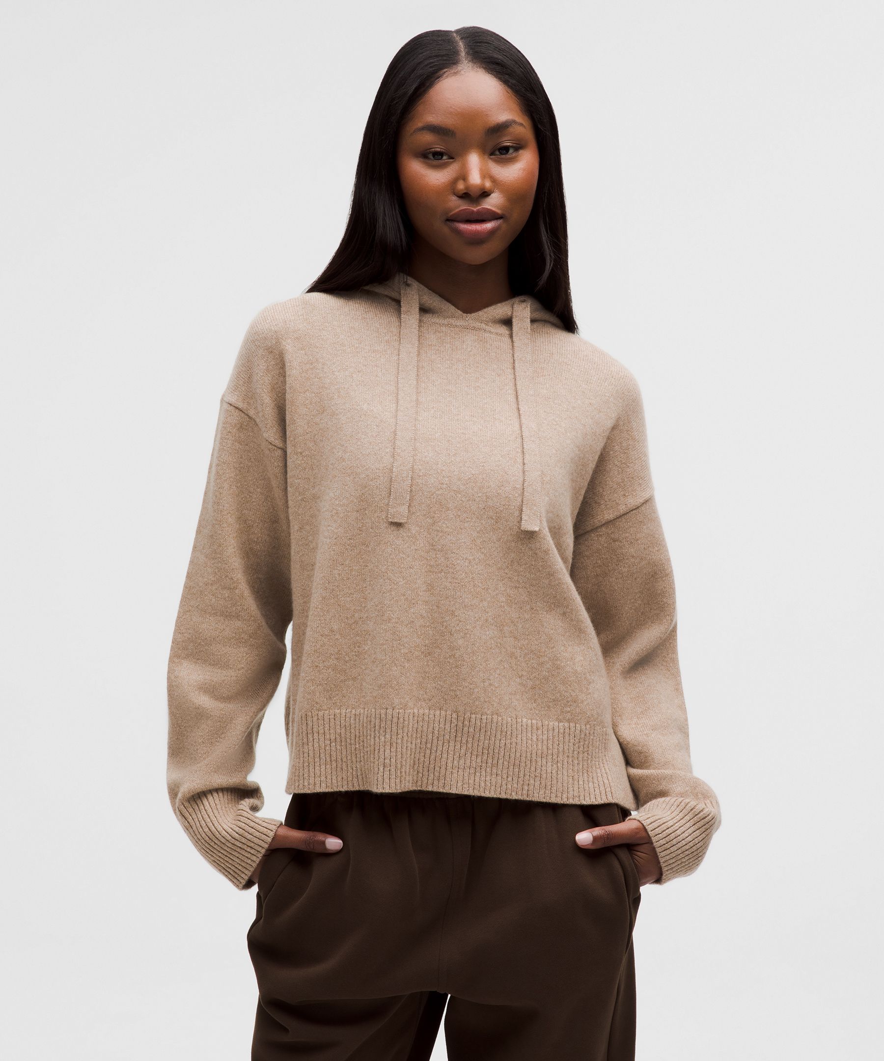 Designed for Casual. A loose fit with a little extra room. Sits below the waistband for moderate, everyday coverage. Your favourite hoodie, all grown up in cashmere. Super-soft cashmere and delicate knit detailing at the hems and cuffs give this slouchy hoodie a luxe look and feel. | lululemon – Women’s Relaxed Cashmere Hoodie – Color Brown – Size Medium