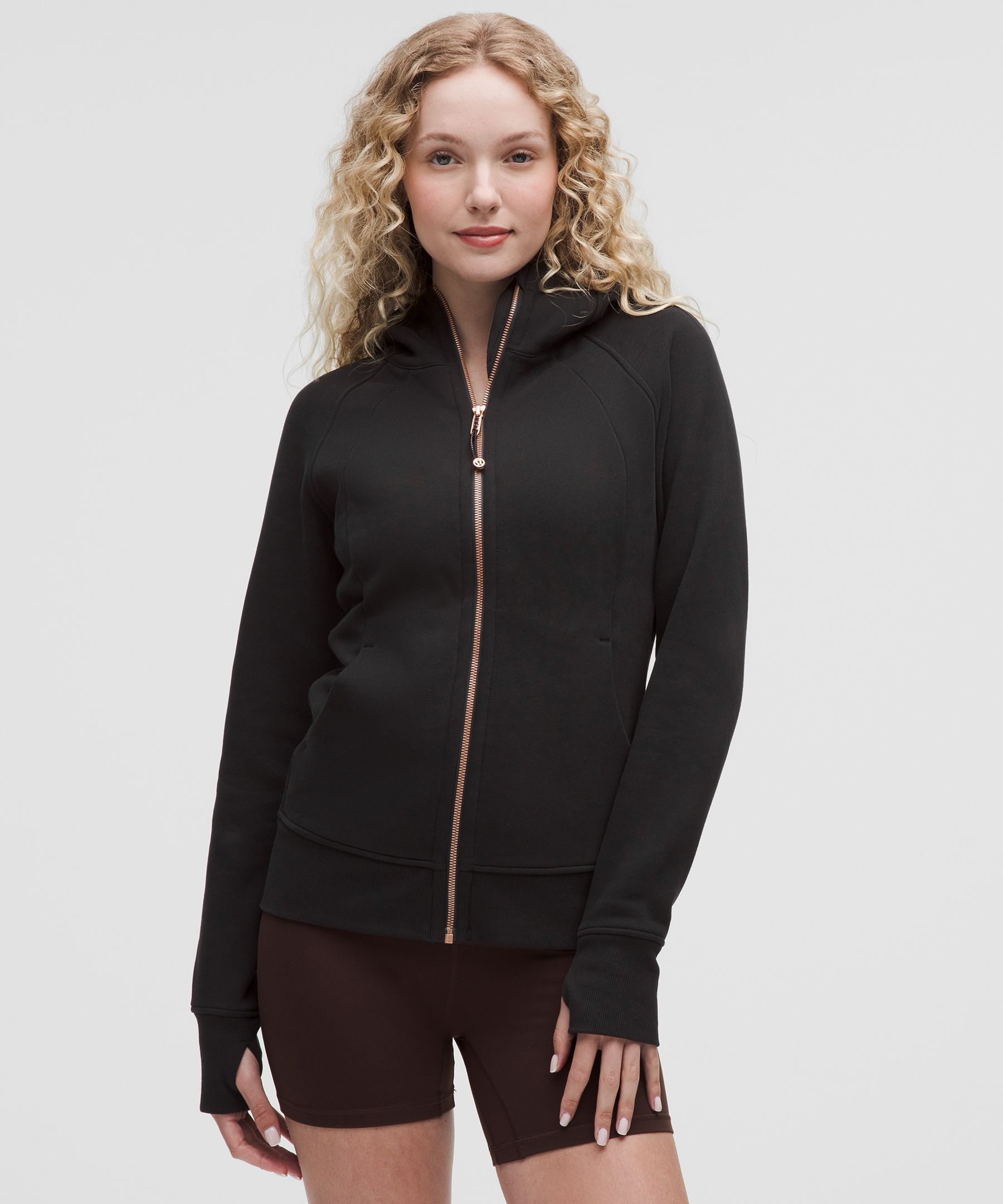Lightweight, Pocketed, Thumbholes, Thermal. Designed for Casual. An easy fit that floats away from your body. Sits below the waistband for moderate, everyday coverage. Serious about softness. This hoodie is all about fleecy fabric and pairs perfectly with our Scuba sweatpants. | lululemon – Women’s Scuba Full-Zip Hoodie – Color Black/Gold – Size 16