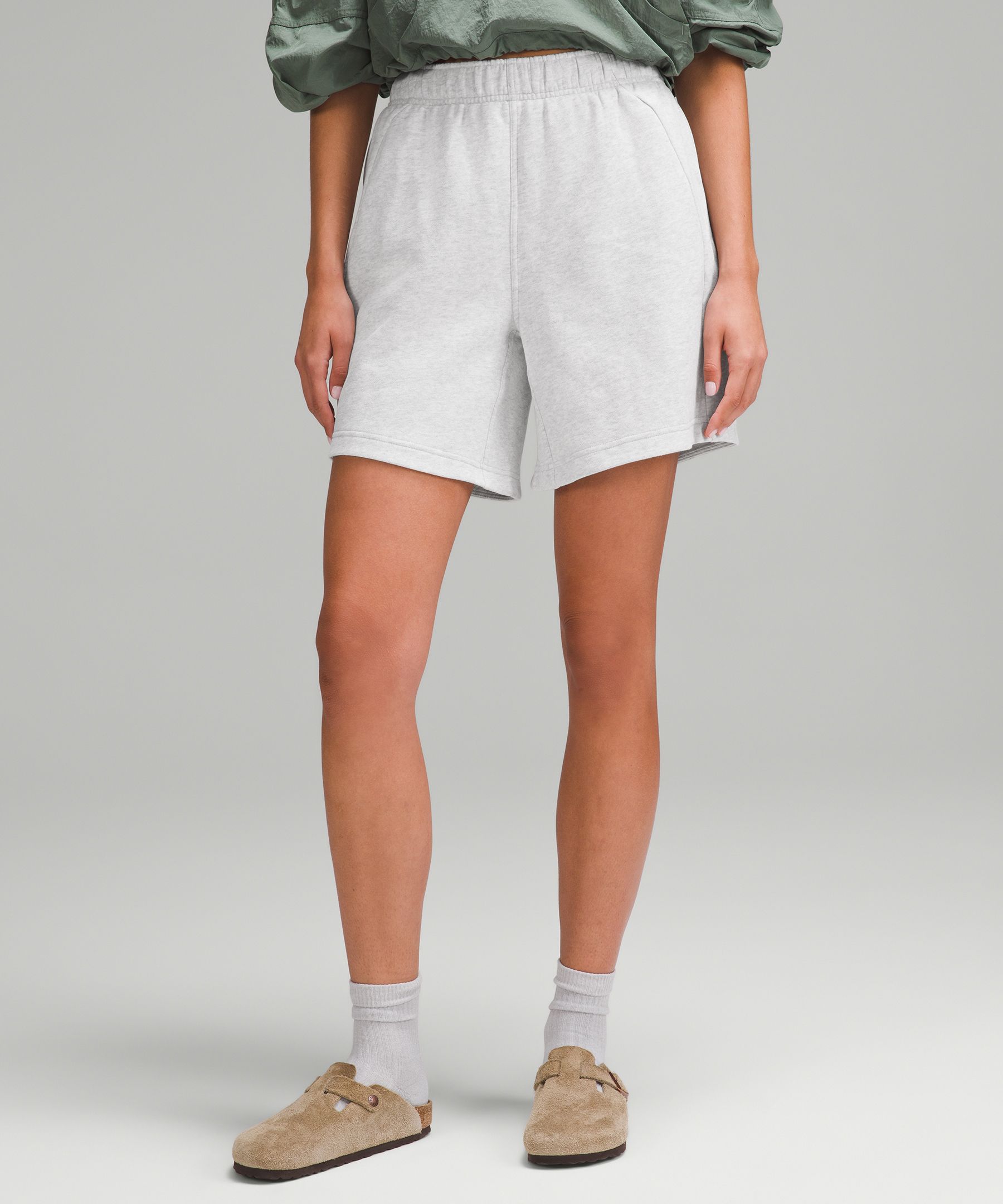 Drawstring, Pocketed. Designed for Casual. Oversized fit is exaggerated and feels extra roomy. Serious about softness. These shorts are all about plush, fleecy fabric and a slouchy oversized fit. | lululemon – Women’s Scuba Mid-Rise Oversized Shorts – 7″ – Color Light Grey/Grey – Size Small