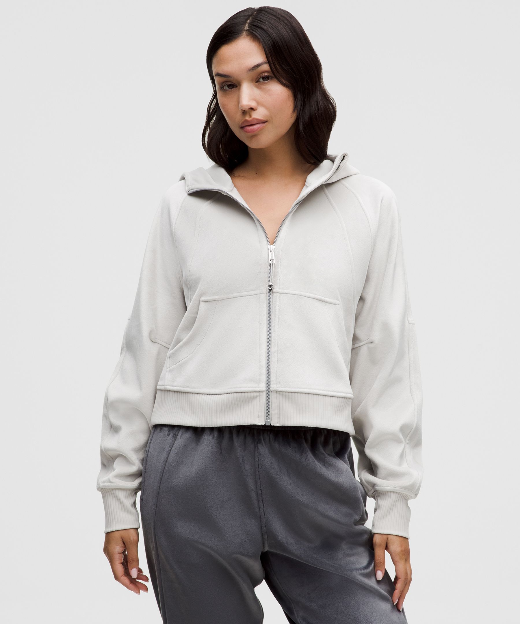 Pocketed, Thumbholes. Designed for Casual. An exaggerated fit that feels extra roomy. Not too short, not too long, just right around the waistband. Textural treat. This version of our Scuba oversized full-zip is made with super-soft velvet and contrasting ribbed details. | lululemon – Women’s Scuba Oversized Full-Zip Hoodie Velvet – Color Grey/White – Size XS/Small