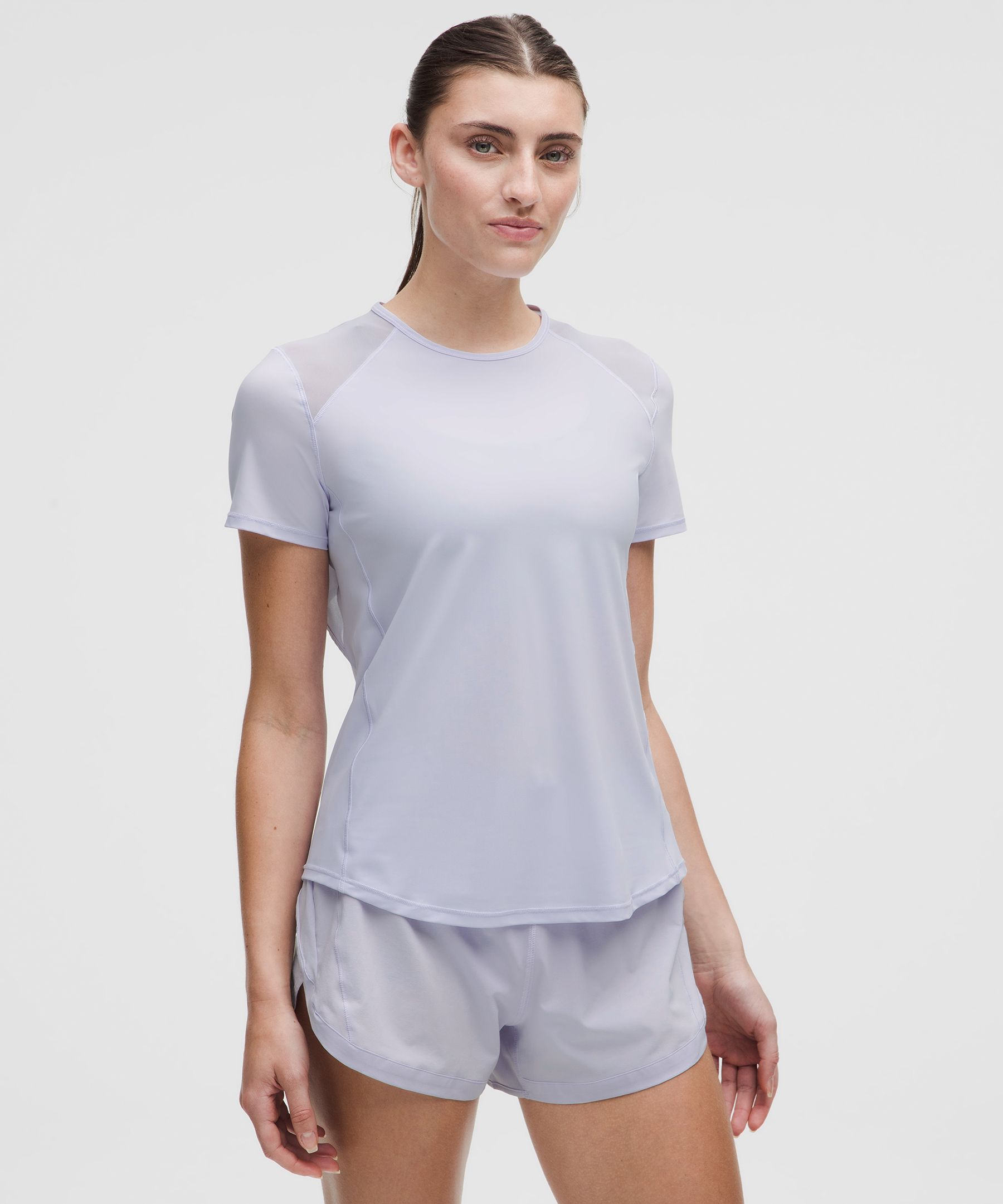Designed for Running. An easy fit that floats away from your body. Sits below the waistband for moderate, everyday coverage. Sprints anyone? This version of our Sculpt short sleeve has mesh overlays and back cutouts for enhanced breathability in sweaty situations. | lululemon – Women’s Sculpt Cross-Vent Short-Sleeve Shirt – Color Blue – Size 6