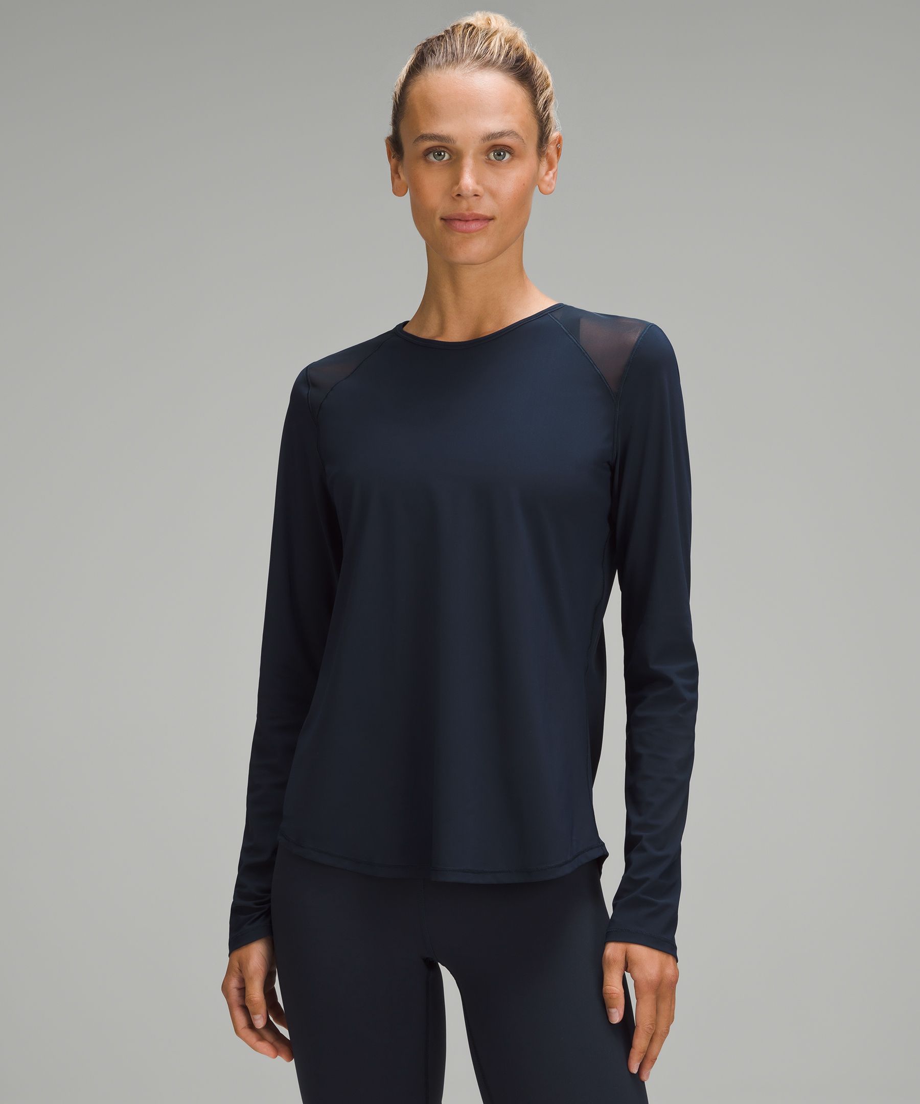 Lightweight. Designed for Running. An easy fit that floats away from your body. Sits below the waistband for moderate, everyday coverage. Sprints anyone? This lightweight long sleeve has mesh fabric panels for breathability in sweaty situations. | lululemon – Women’s Sculpt Long-Sleeve Shirt – Color Blue – Size 4